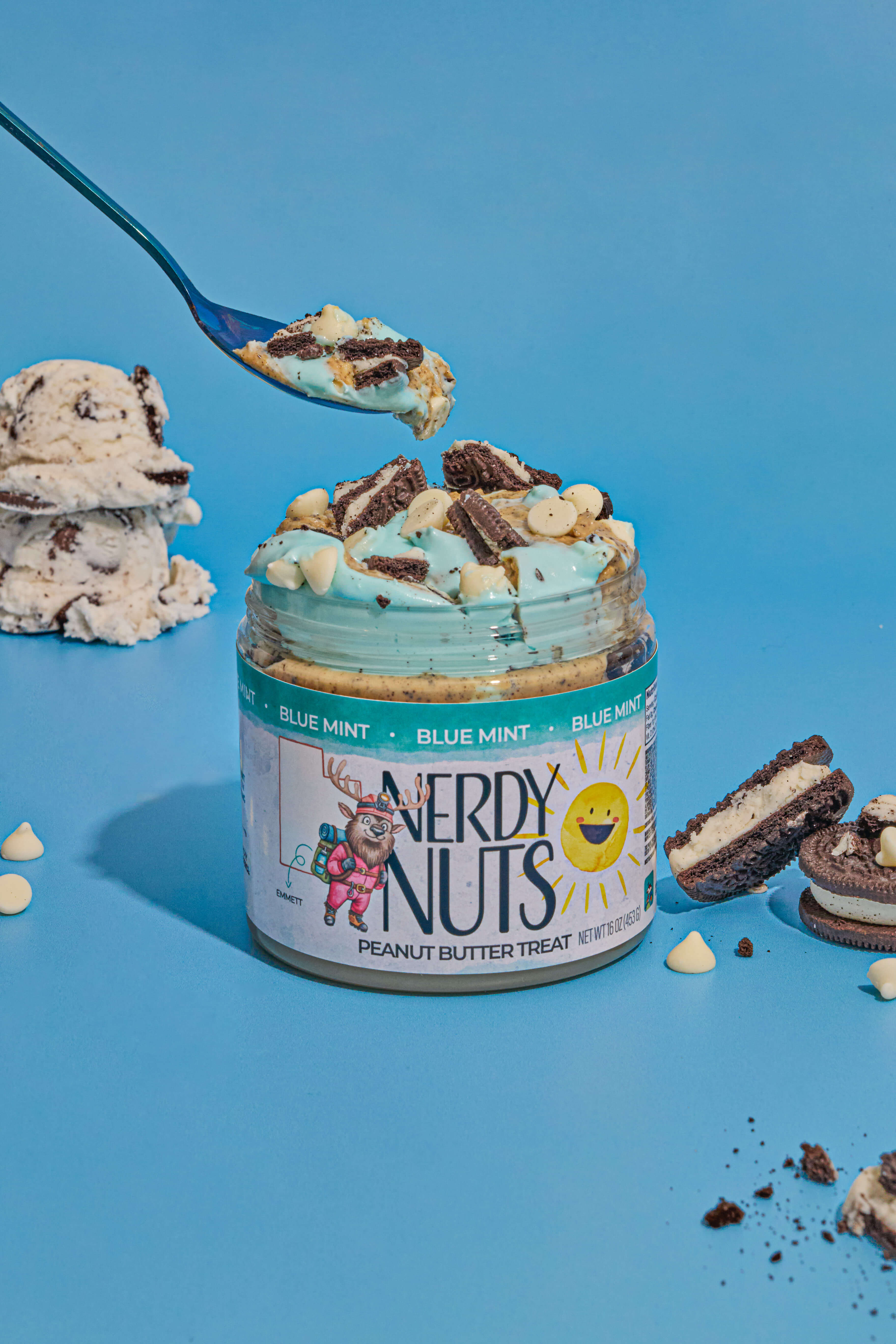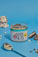 Inspired by the USU original, our cookies & cream ice cream peanut butter is layered on vanilla ice cream sauce, topped with blue mint mallow frosting, white chocolate chips, & chocolate cookies & cream!