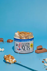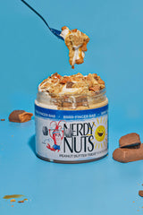 White chocolate peanut butter is layered on fluff & caramel topping, topped with chunks of chocolate PB crispy candy bars, caramel bits, & graham crackers!