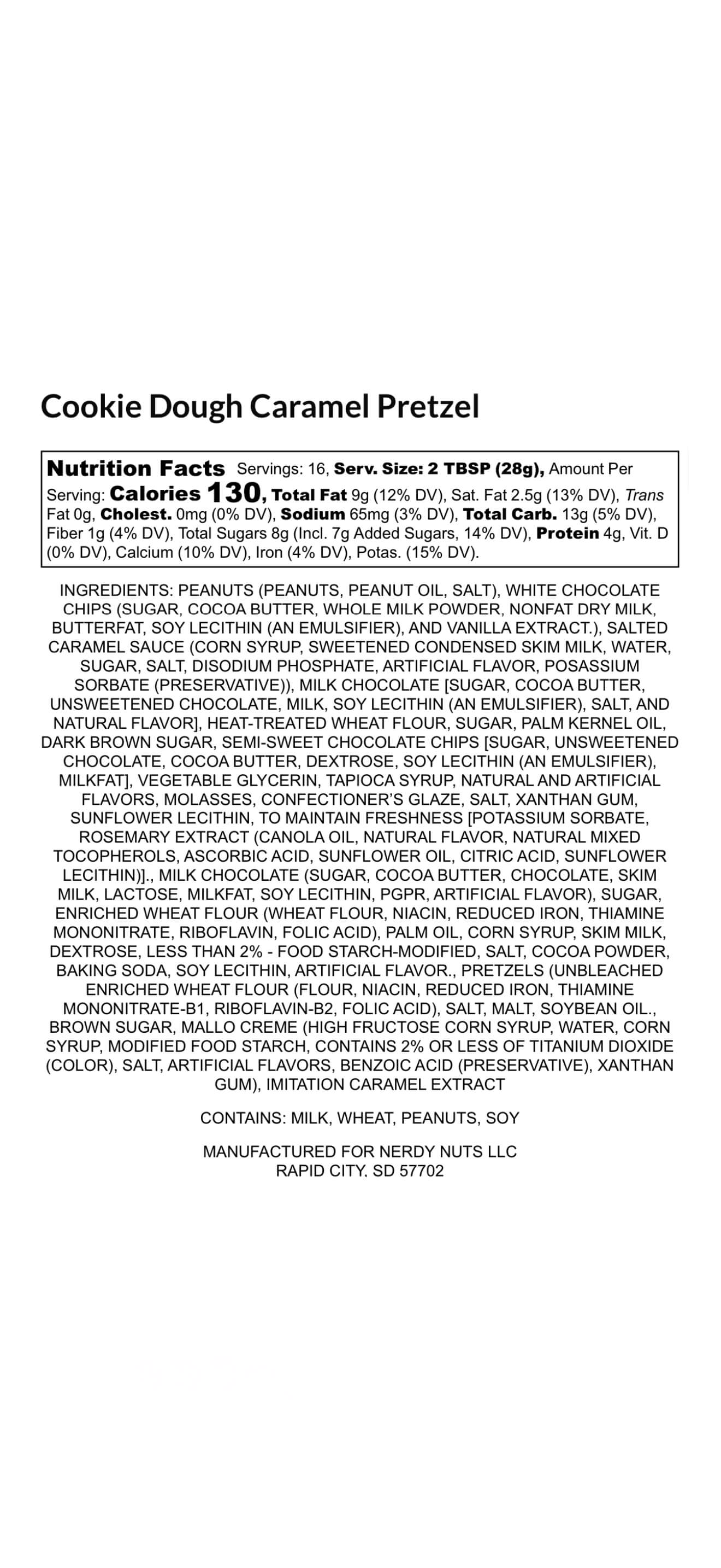 Brown butter peanut butter is layered on salted caramel mallow creme, topped with chocolate covered cookie dough, pretzels, & caramel stix candy bar chunks!