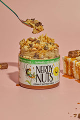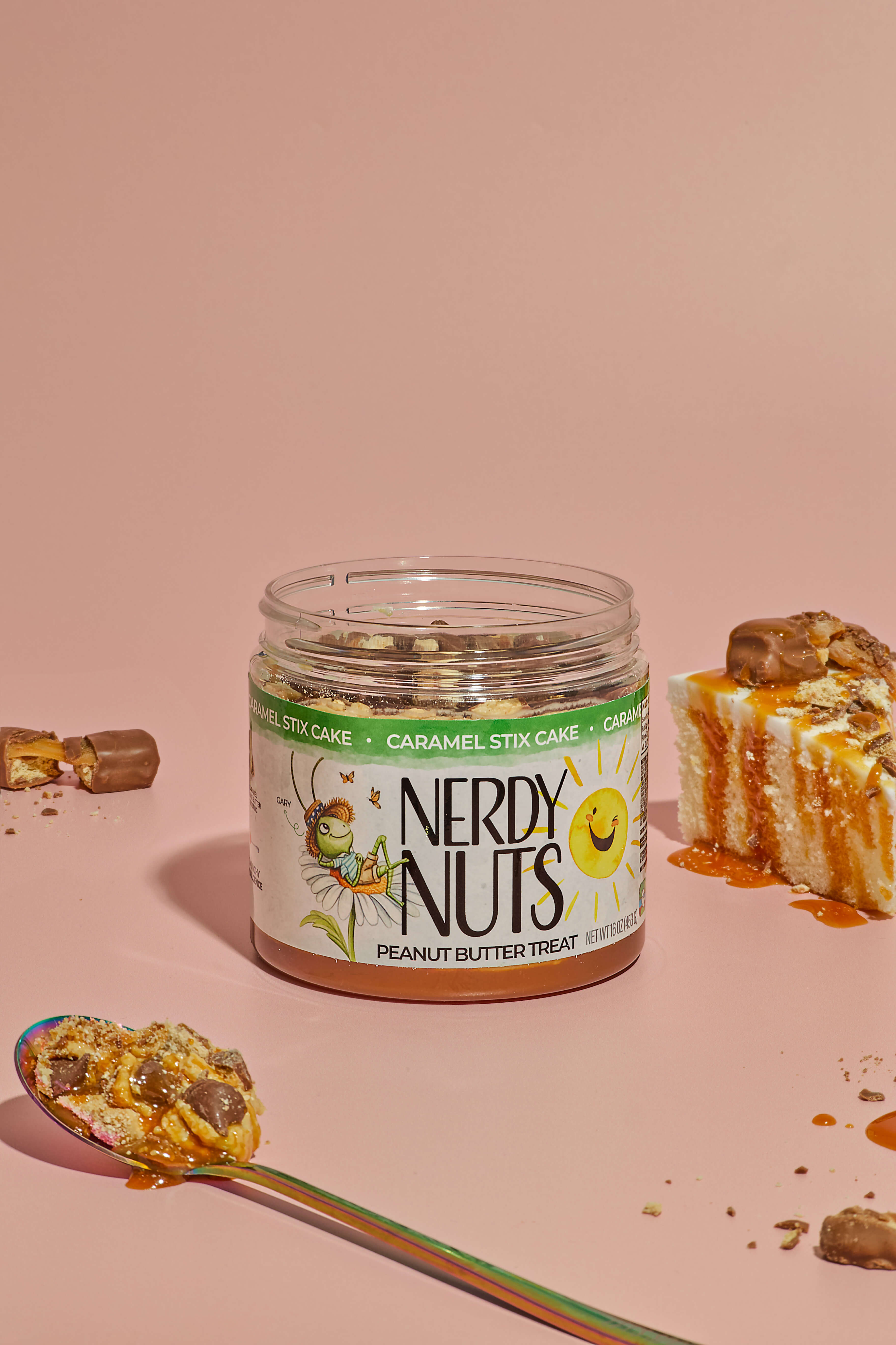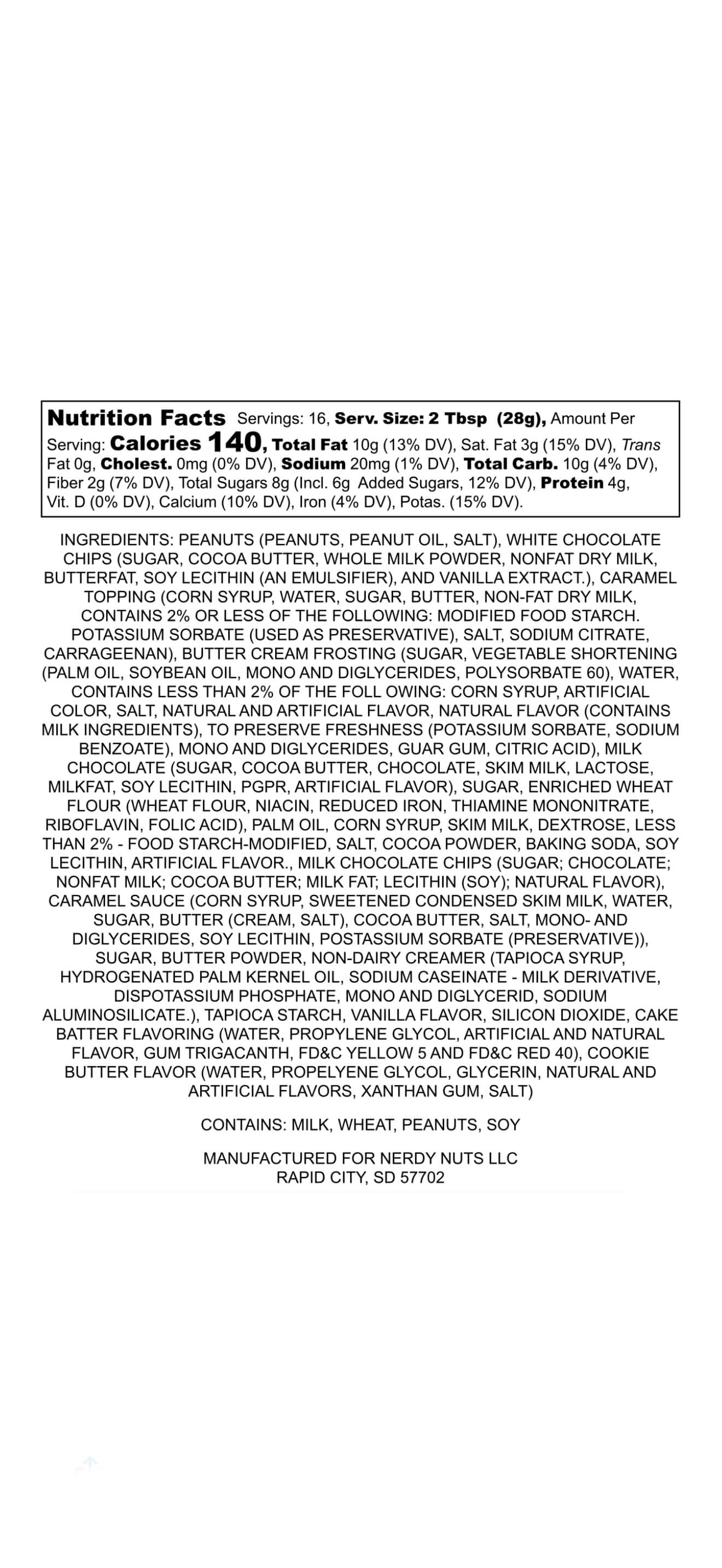 Vanilla cake batter peanut butter is layered on salted caramel topping, frosted with caramel cookie butter frosting, topped with caramel stix candy & chocolate chips!