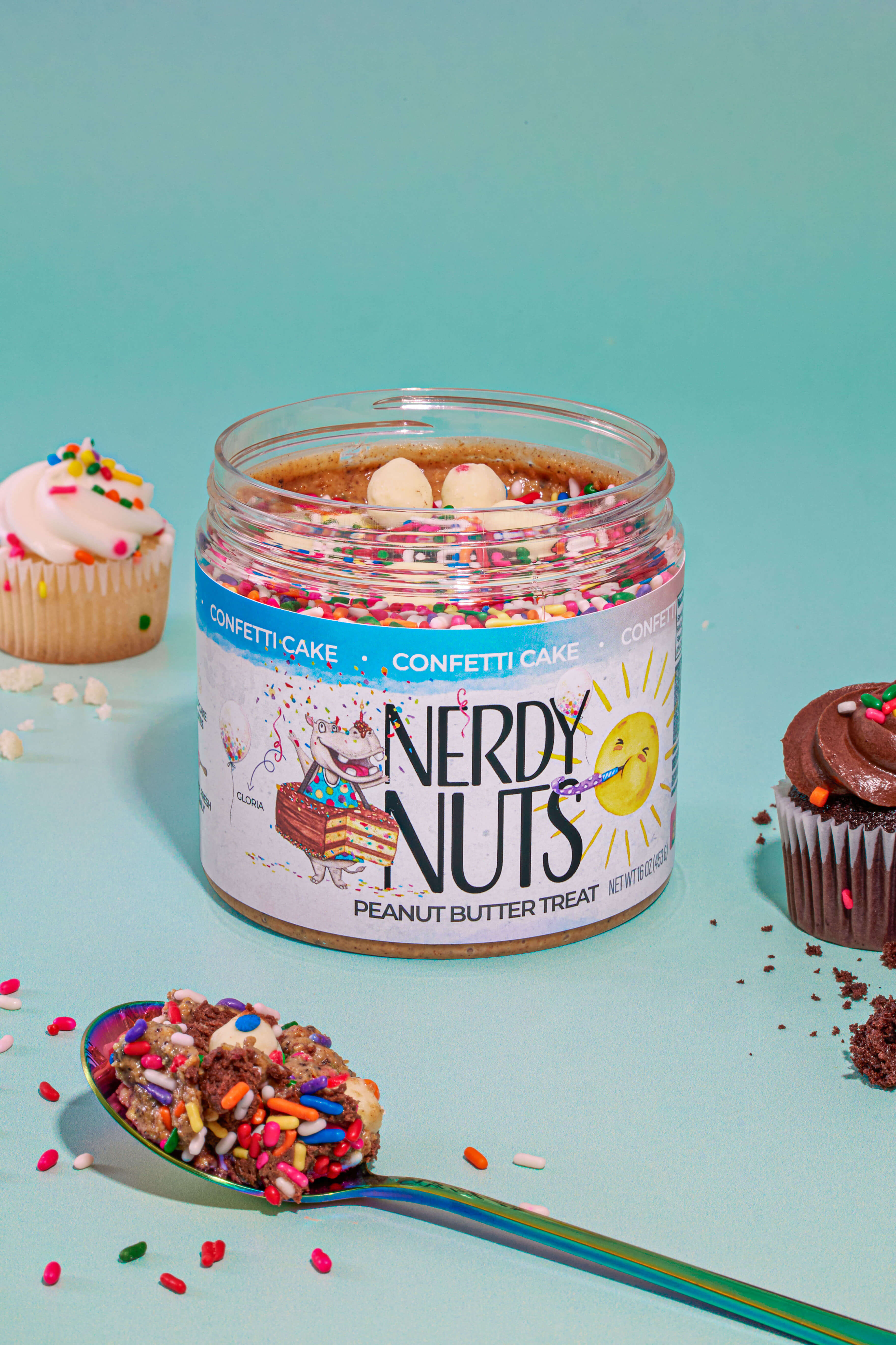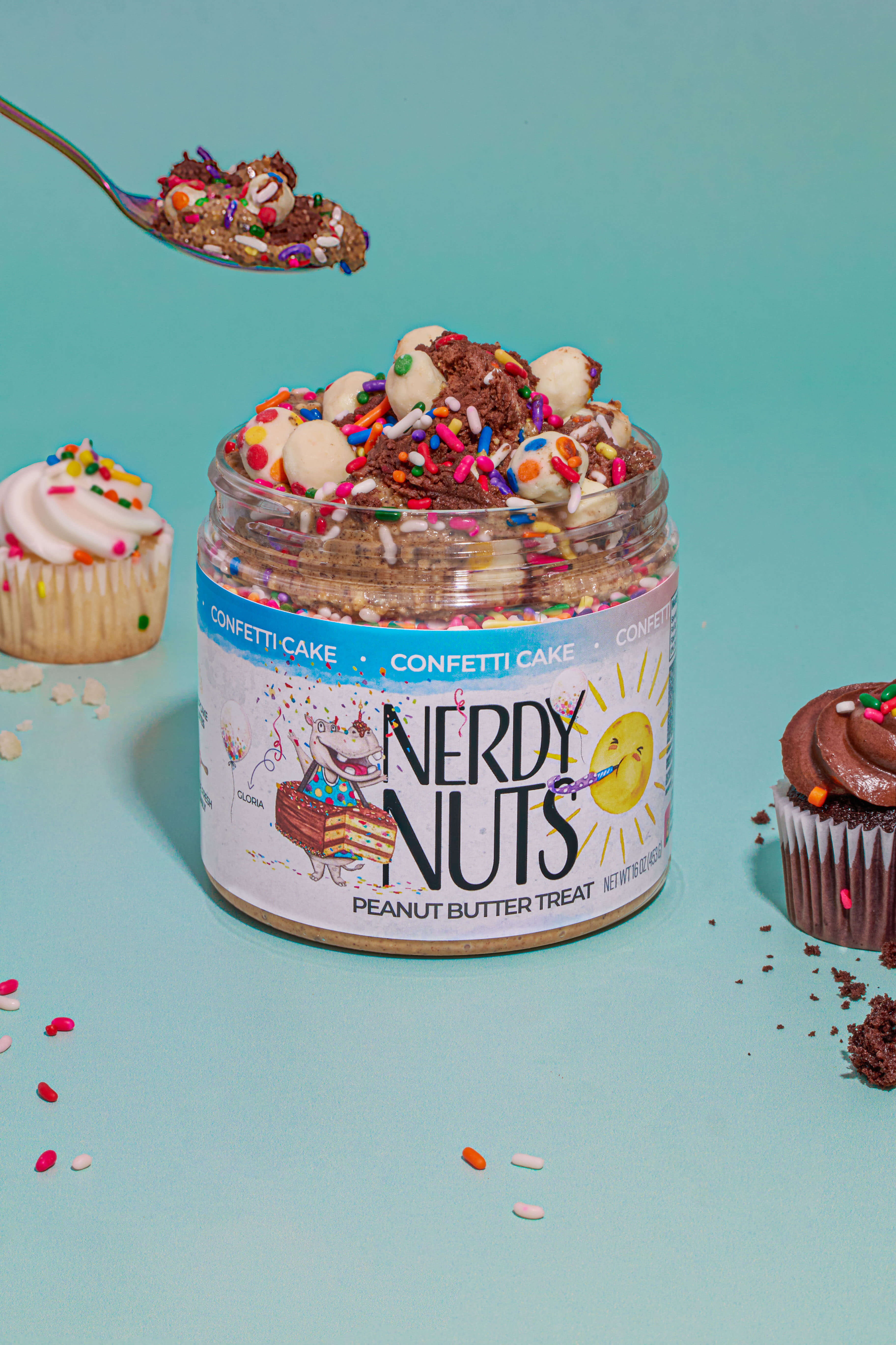 Confetti Cake starts with sweet honey white chocolate peanut butter with OREOS and cake bites blended into the base. We wanted to celebrate BIG, so we topped it off with chocolate frosting, sprinkles, and more cupcake bites!