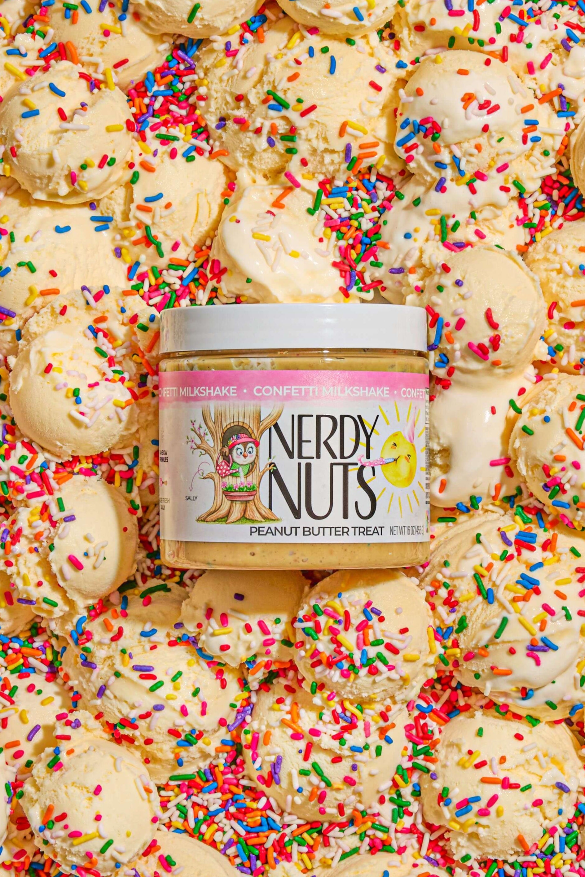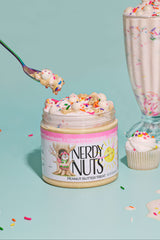 Cupcake peanut butter is swirled with milkshake mallow frosting, chocolate birthday cake cookie bites, & rainbow sprinkles!