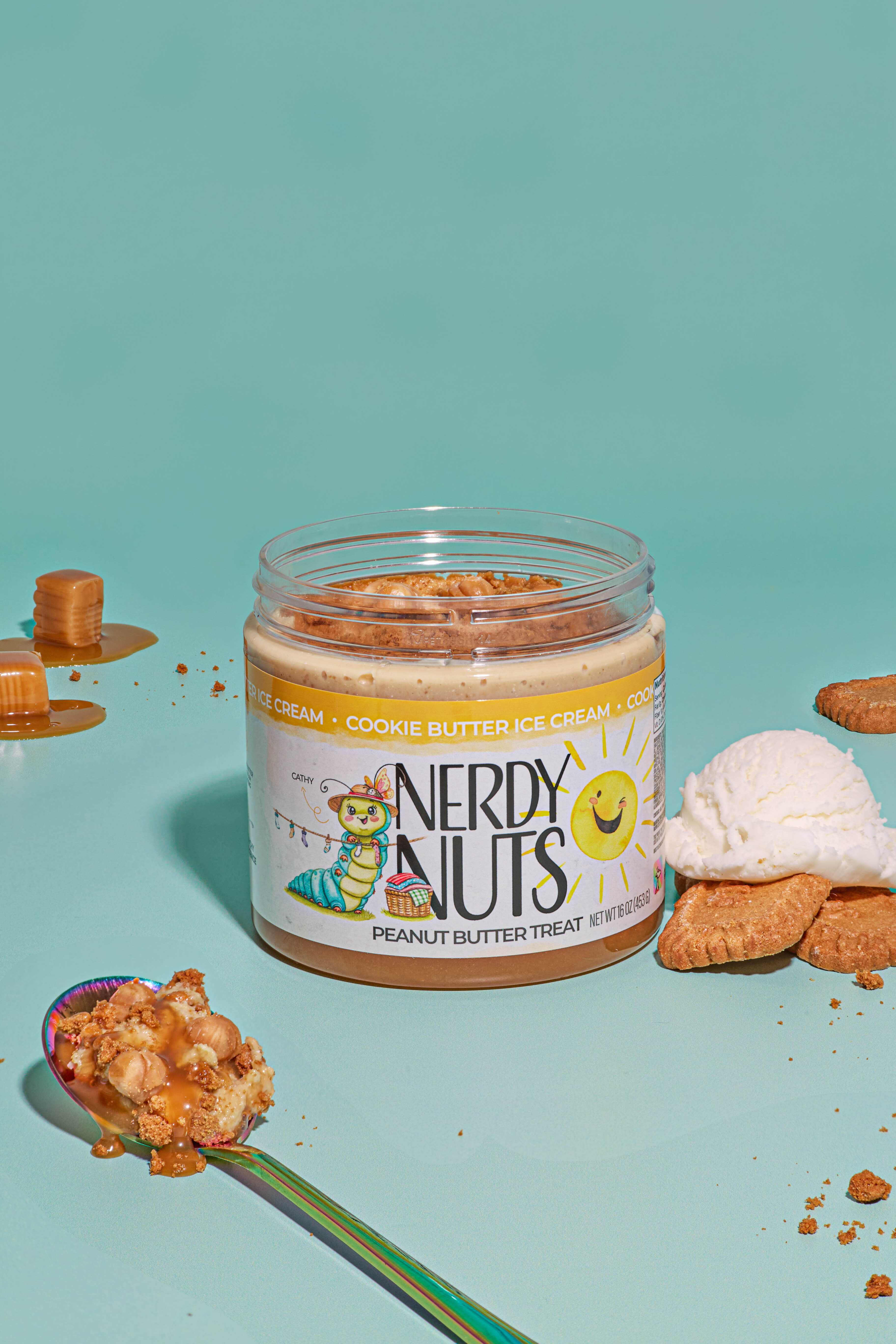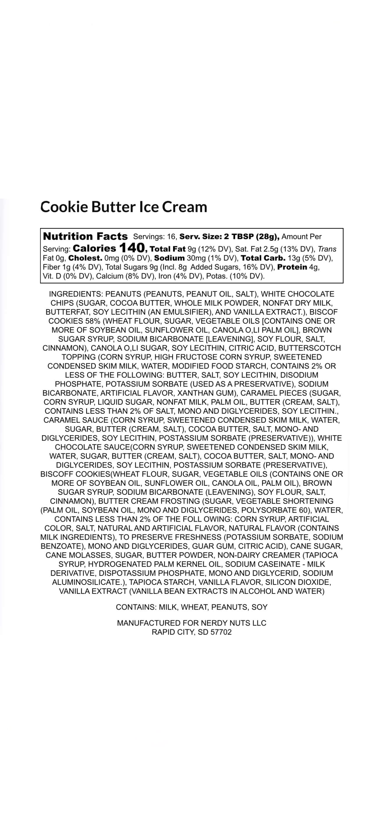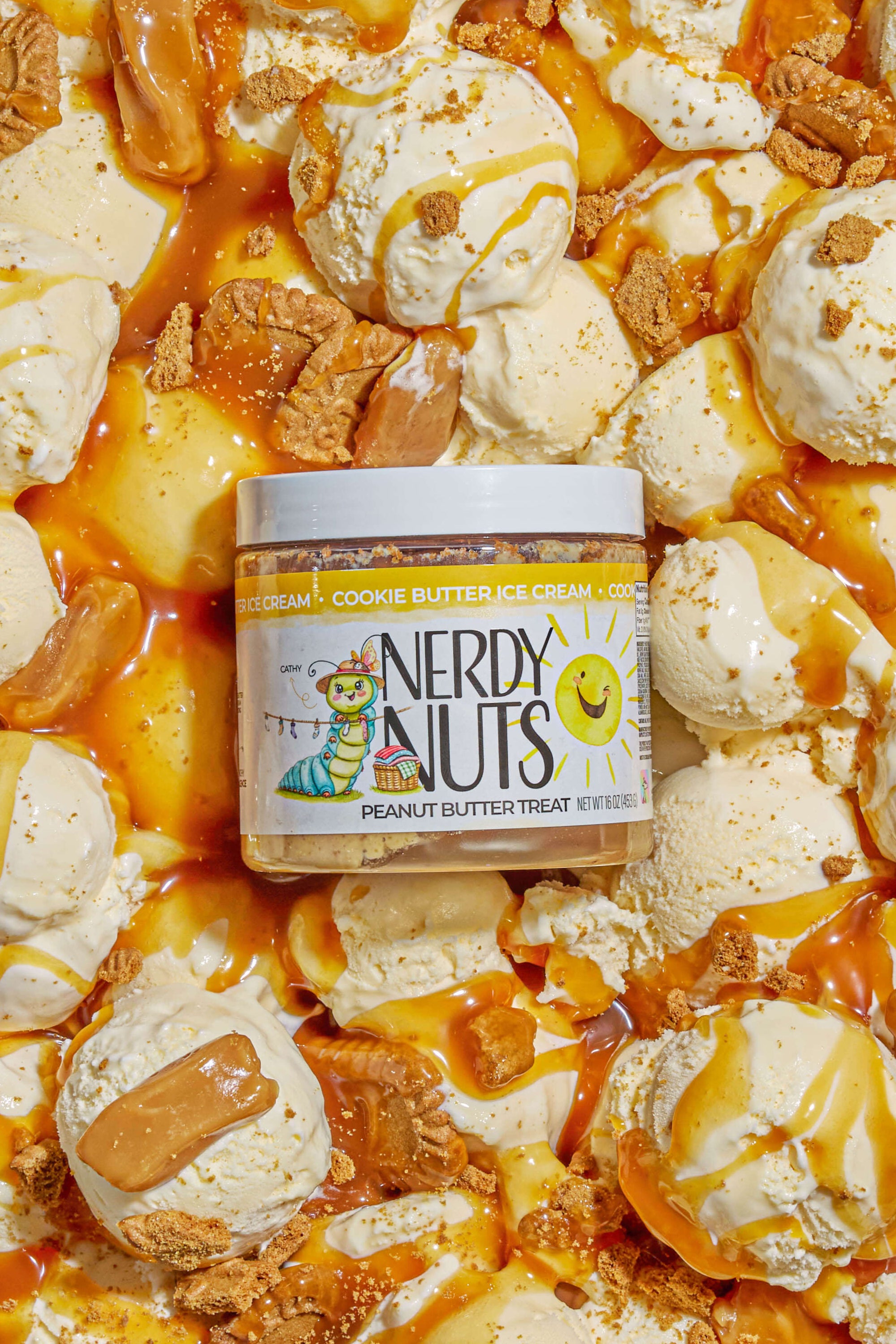 Ice cream peanut butter is layered on cookie butter sauce, topped with cookie butter ice cream frosting, cookie butter cookie crumbs, & caramel bits!