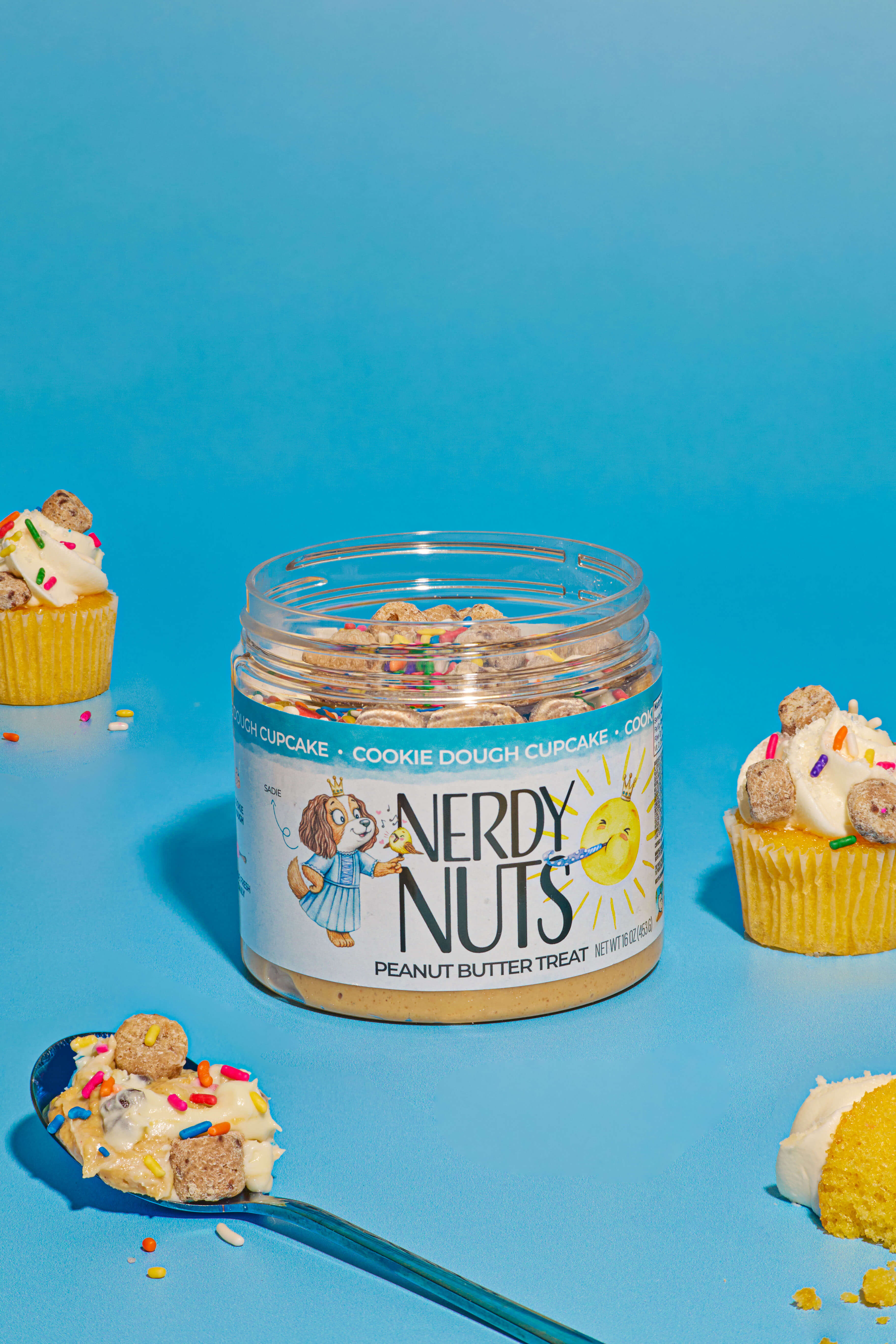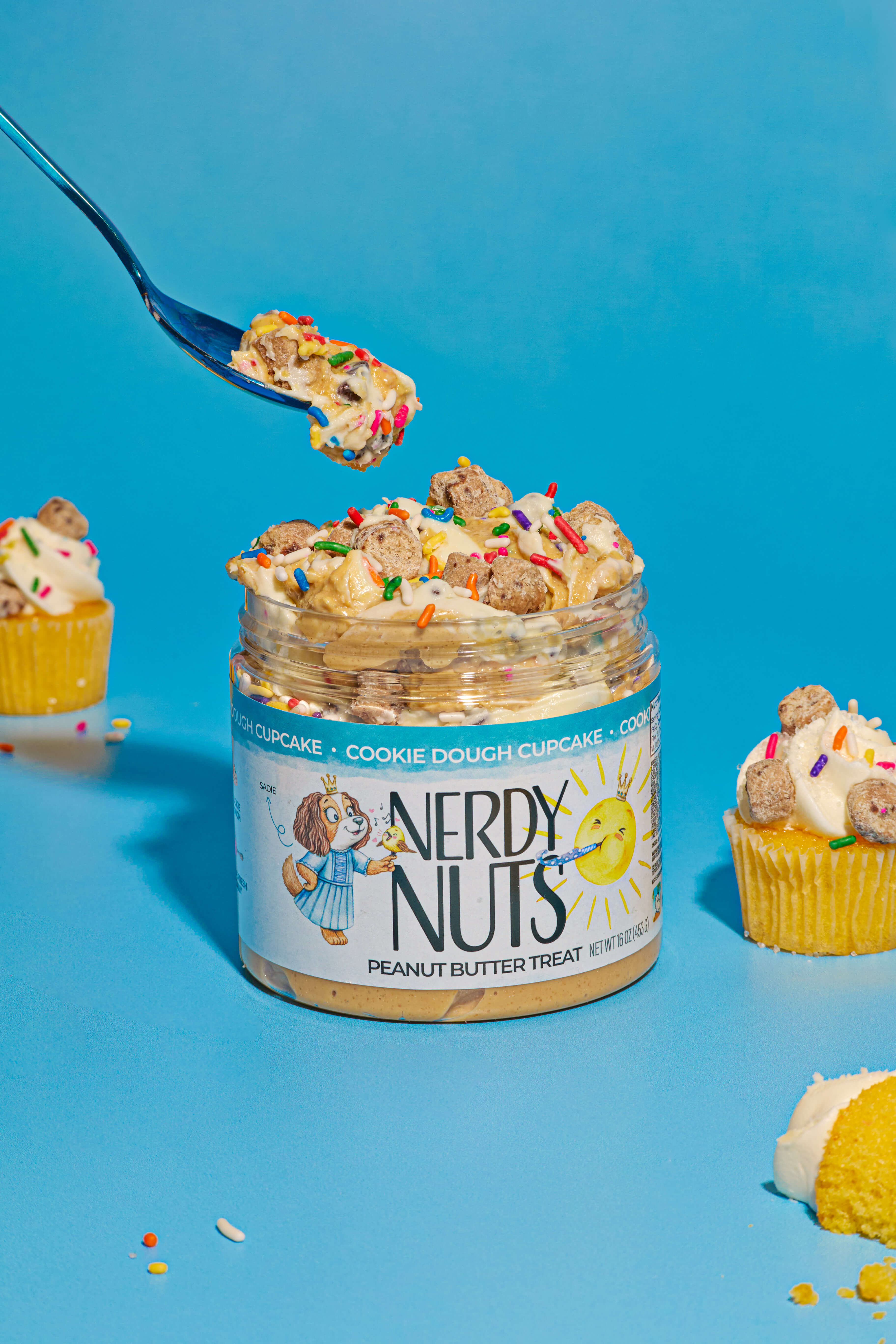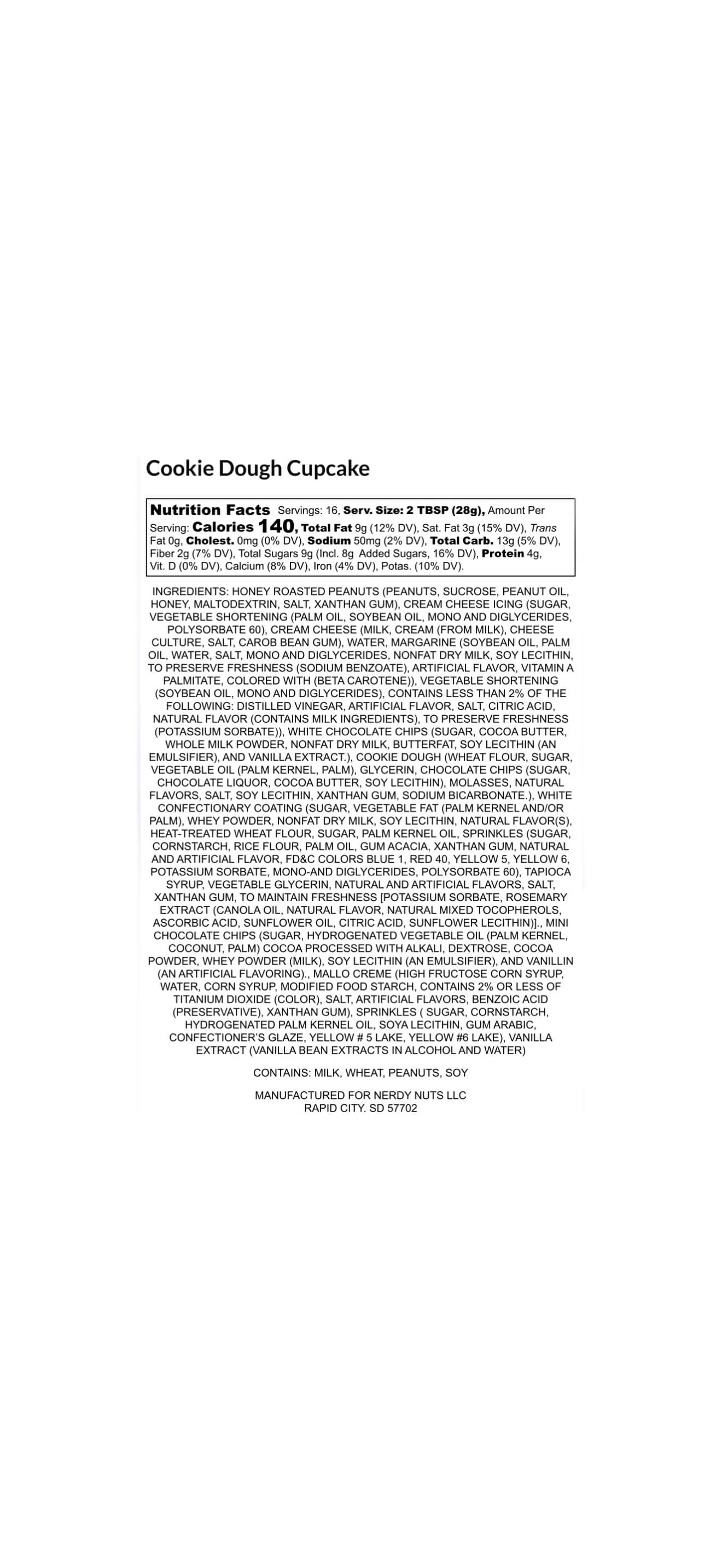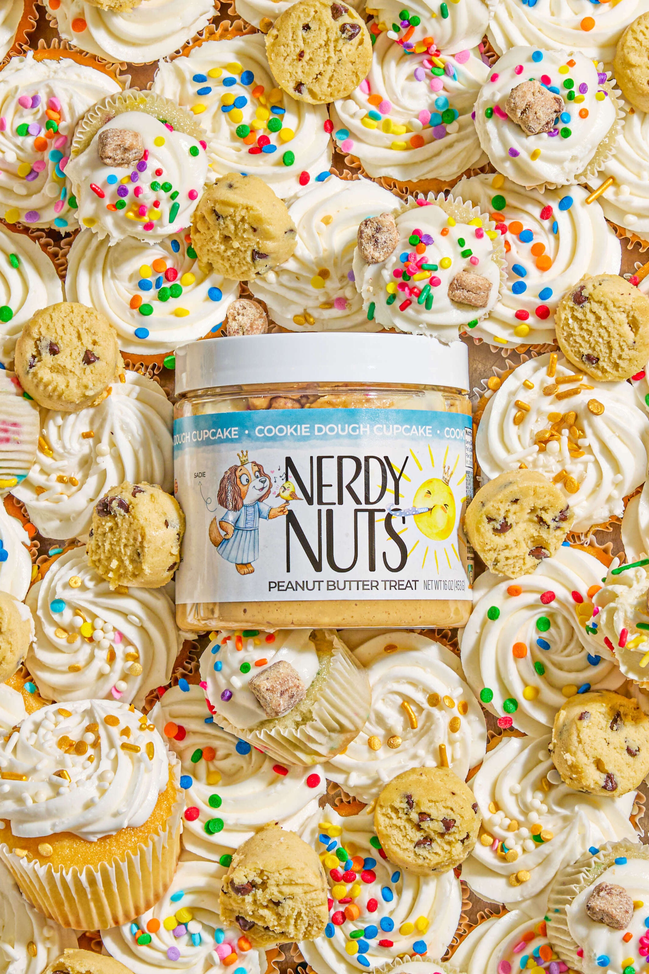 Sweet cupcake peanut butter is iced with cream cheese choco chip cookie dough frosting, gobs of cookie dough, & rainbow sprinkles!