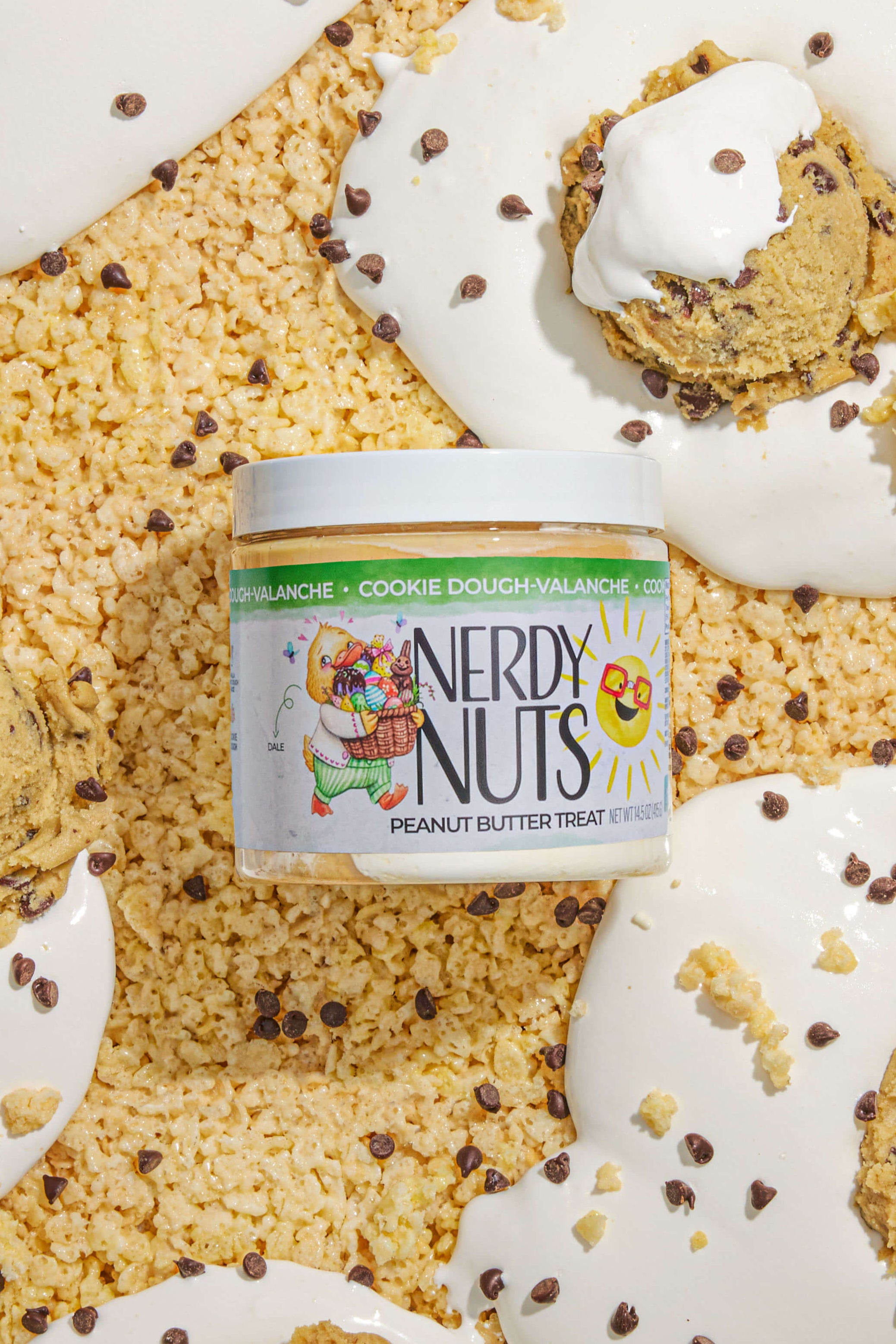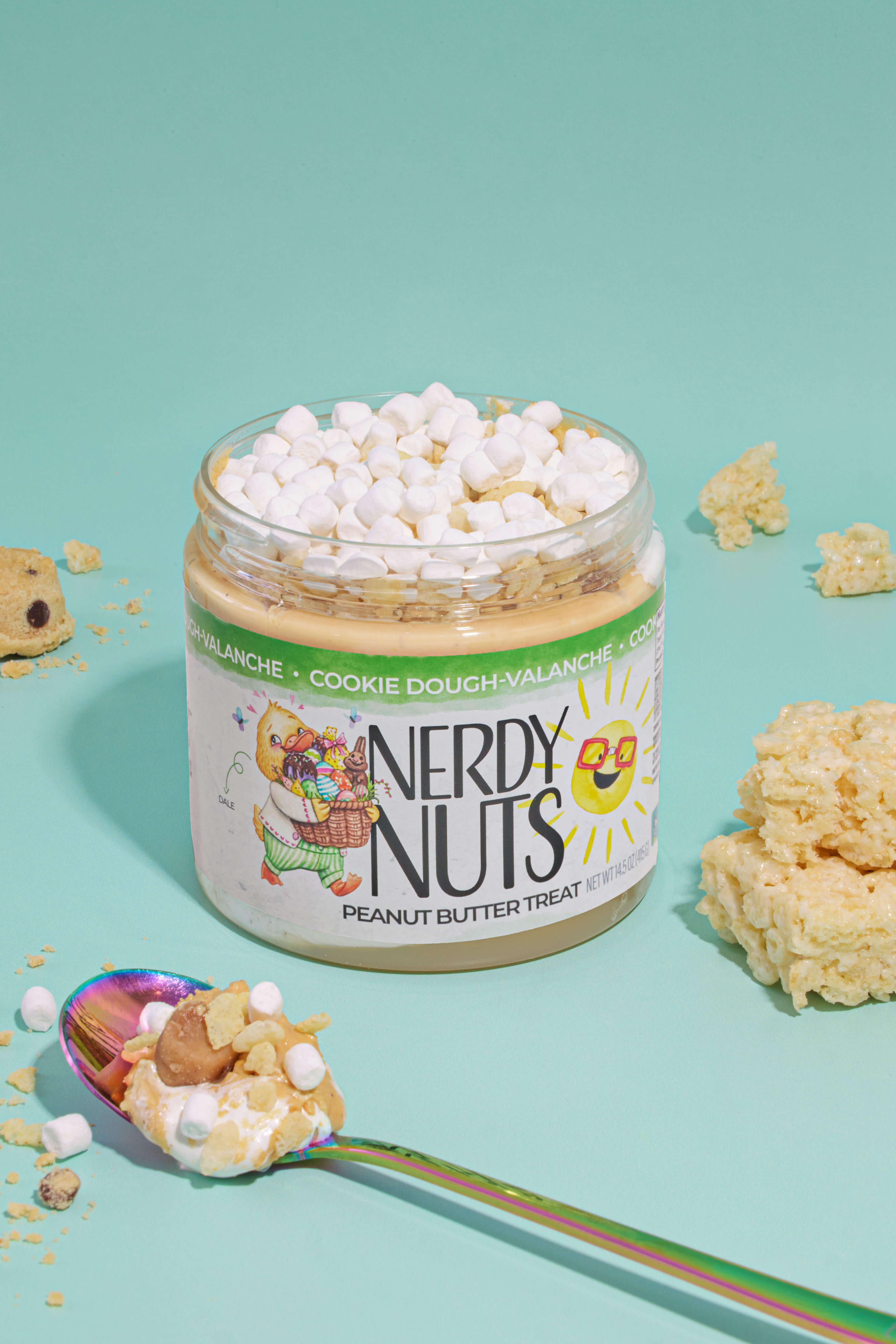 Brown sugar white chocolate peanut butter is layered on fluff and vanilla cookie dough sauce, topped with chocolate dehydrated mallow bits, crispy rice cereal, and cookie dough bites! Cookie dough rice crispy bar!