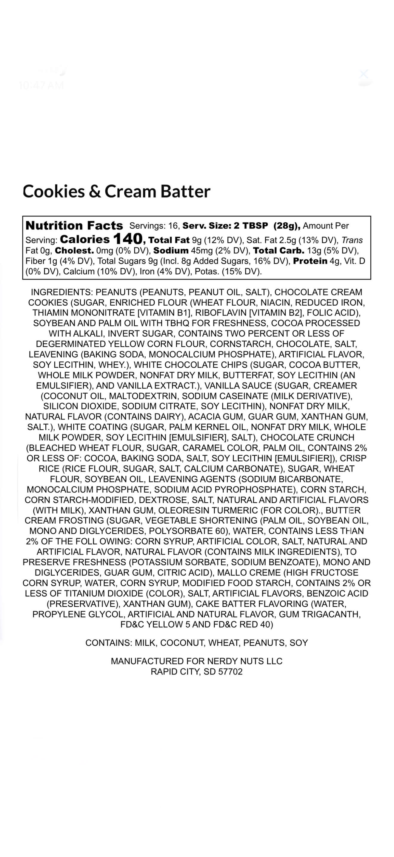 Cookies & cream yellow cake peanut butter is layered on chocolate cookies & cream, topped with cookies & cream clusters and cookies & cream cake battery topping!