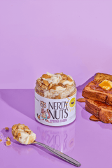 White chocolate peanut butter with blended cinnamon bun bites is swirled with buttercream frosting, cinnamon vanilla sauce, maple syrup, topped with Nilla Wafers for the French Toast texture!