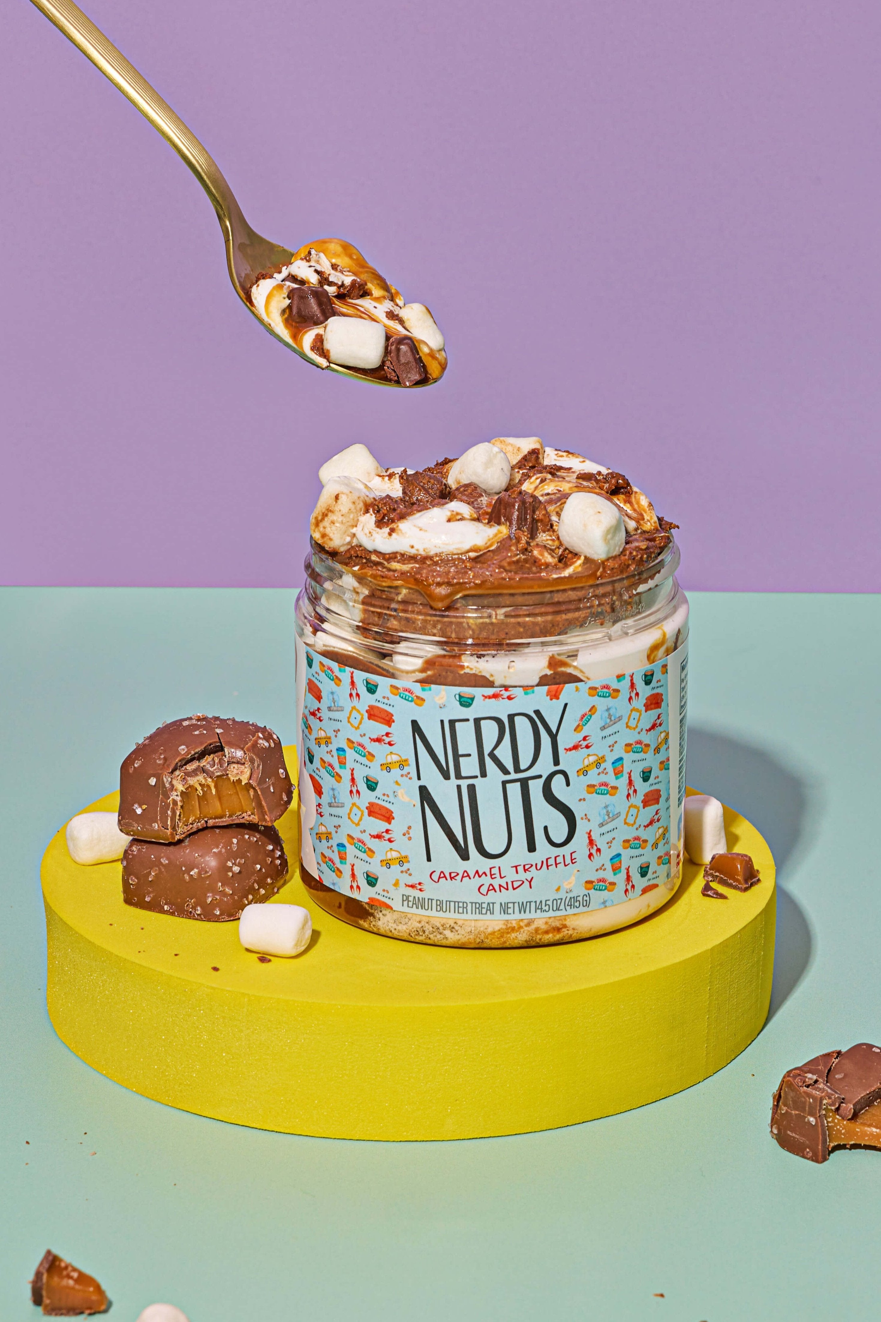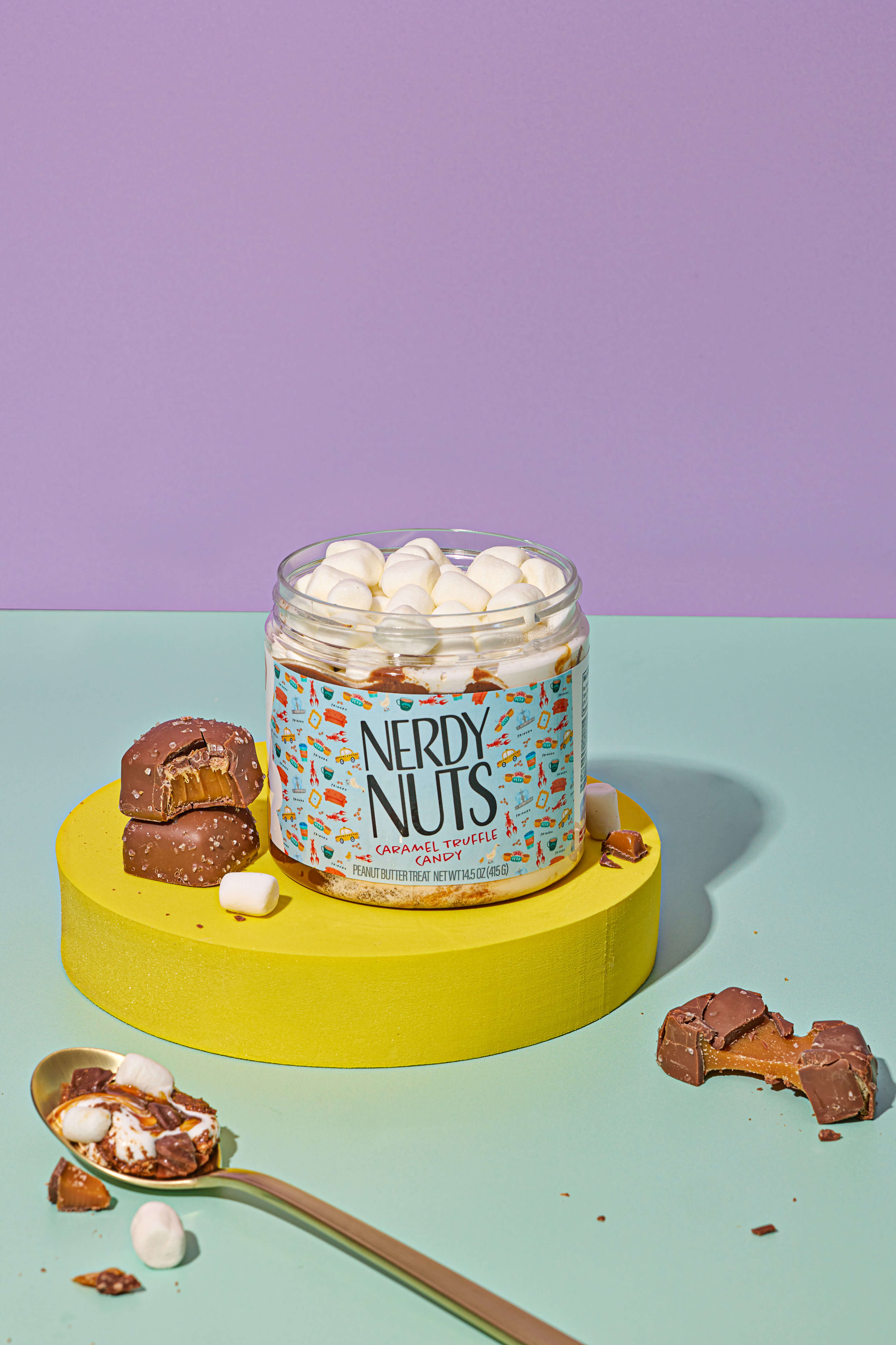 Sweet dark chocolate peanut butter is layered on fluff and sea salt caramel toffee sauce, topped with fluffy mini marshmallows & mini sea salt caramel truffles!
