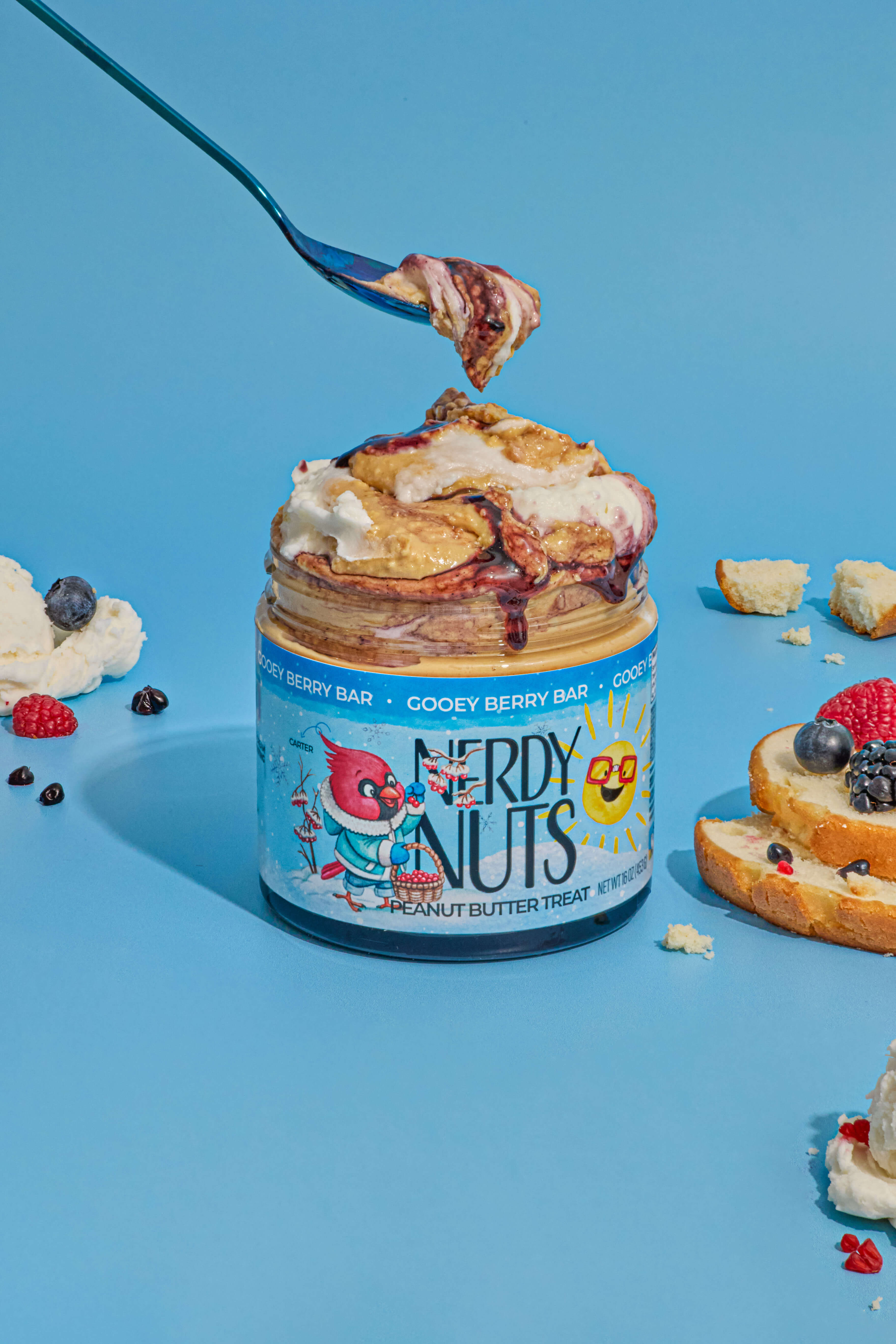 Buttery, yellow cake peanut butter is layered on a mixed berry sauce, topped with a dollop of ice cream flavored frosting!