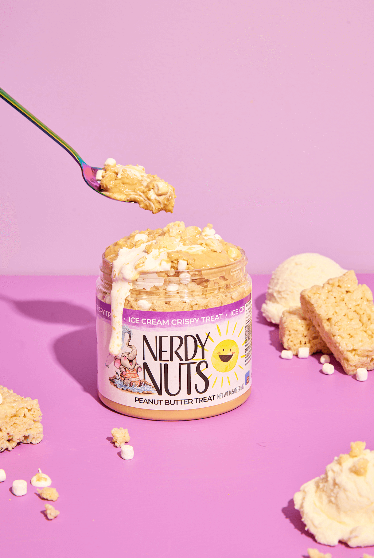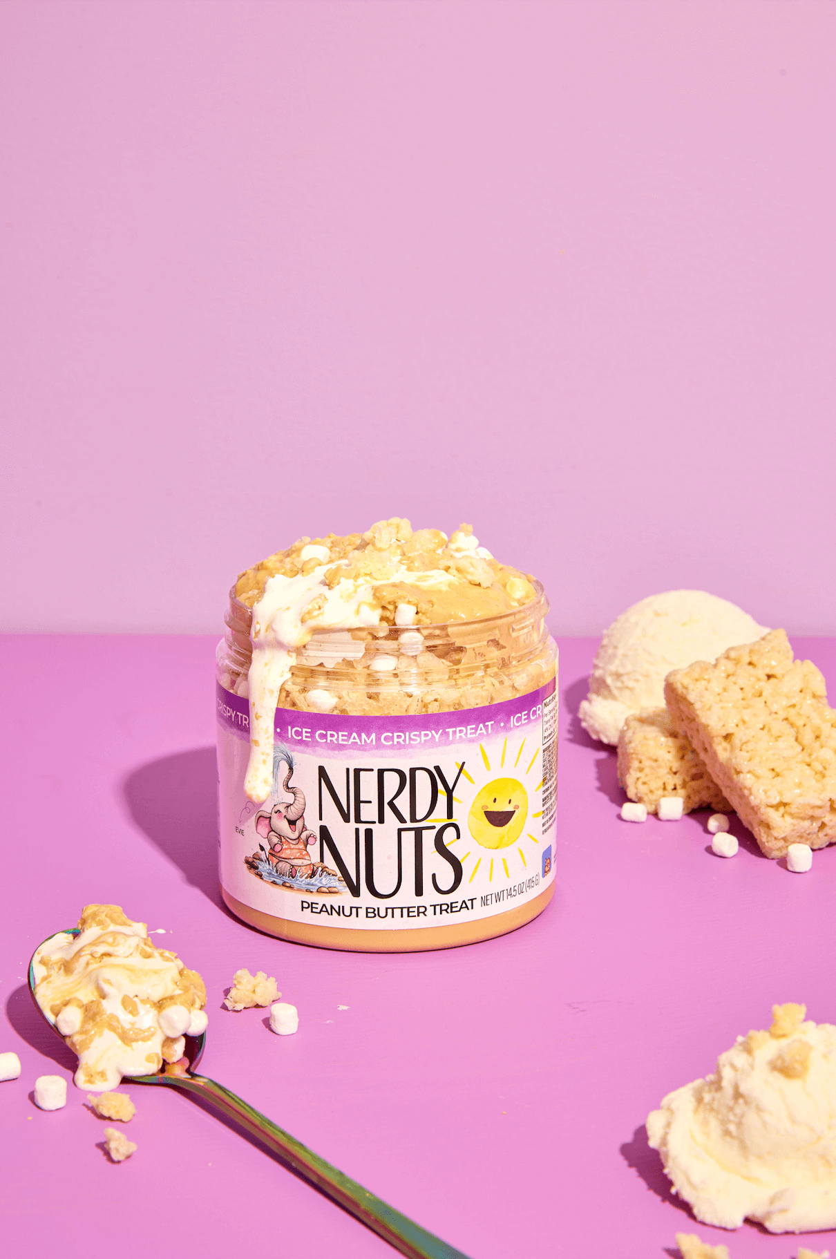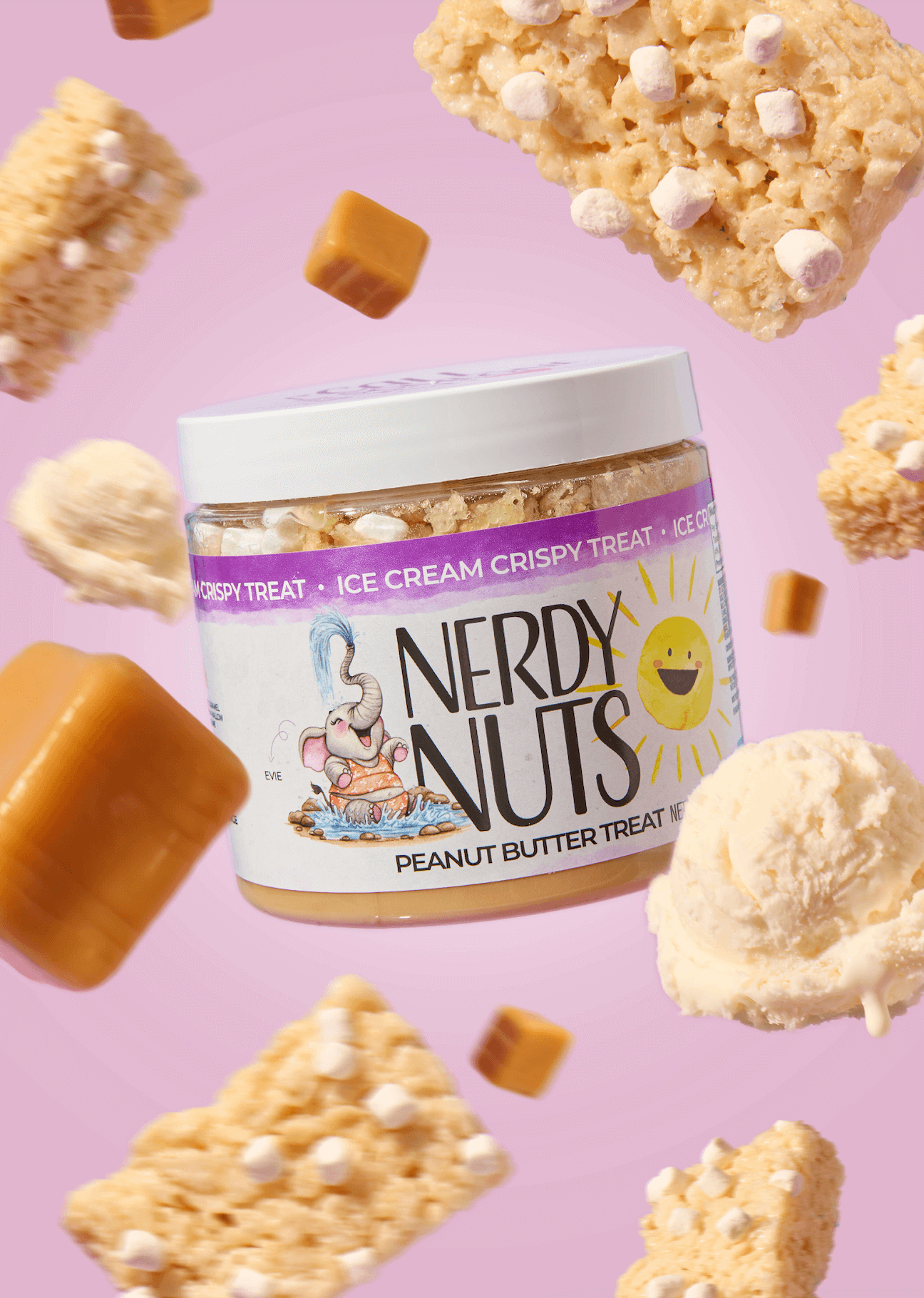 “Smunchy” vanilla ice cream peanut butter is layered on fluff and salted caramel ice cream mallow creme, topped with crispy rice cereal & dehydrated mallow bits!