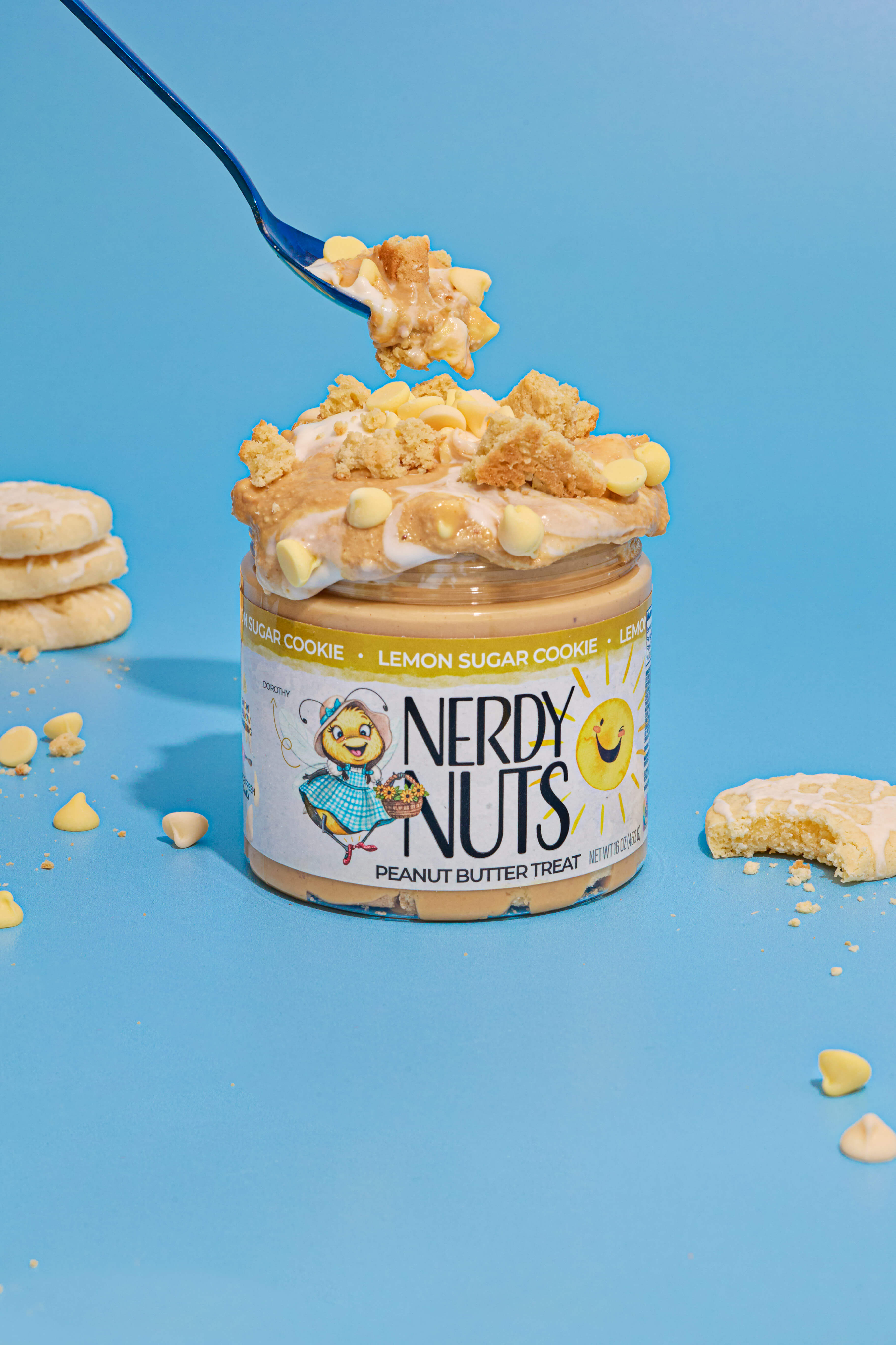 “Smunchy” vanilla peanut butter is layered on sugar cookie chunks, topped with lemon mallow frosting, and lemon chips!