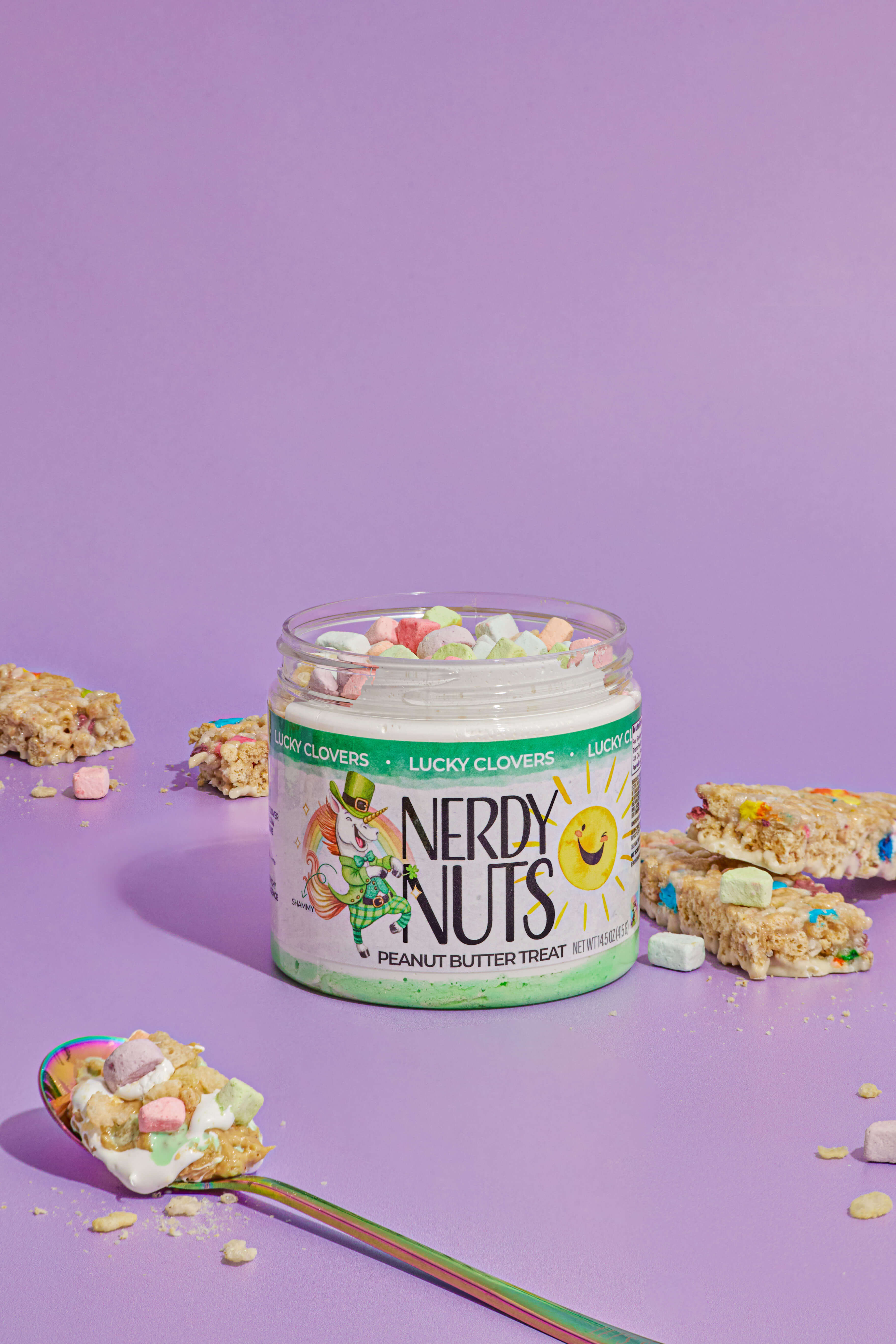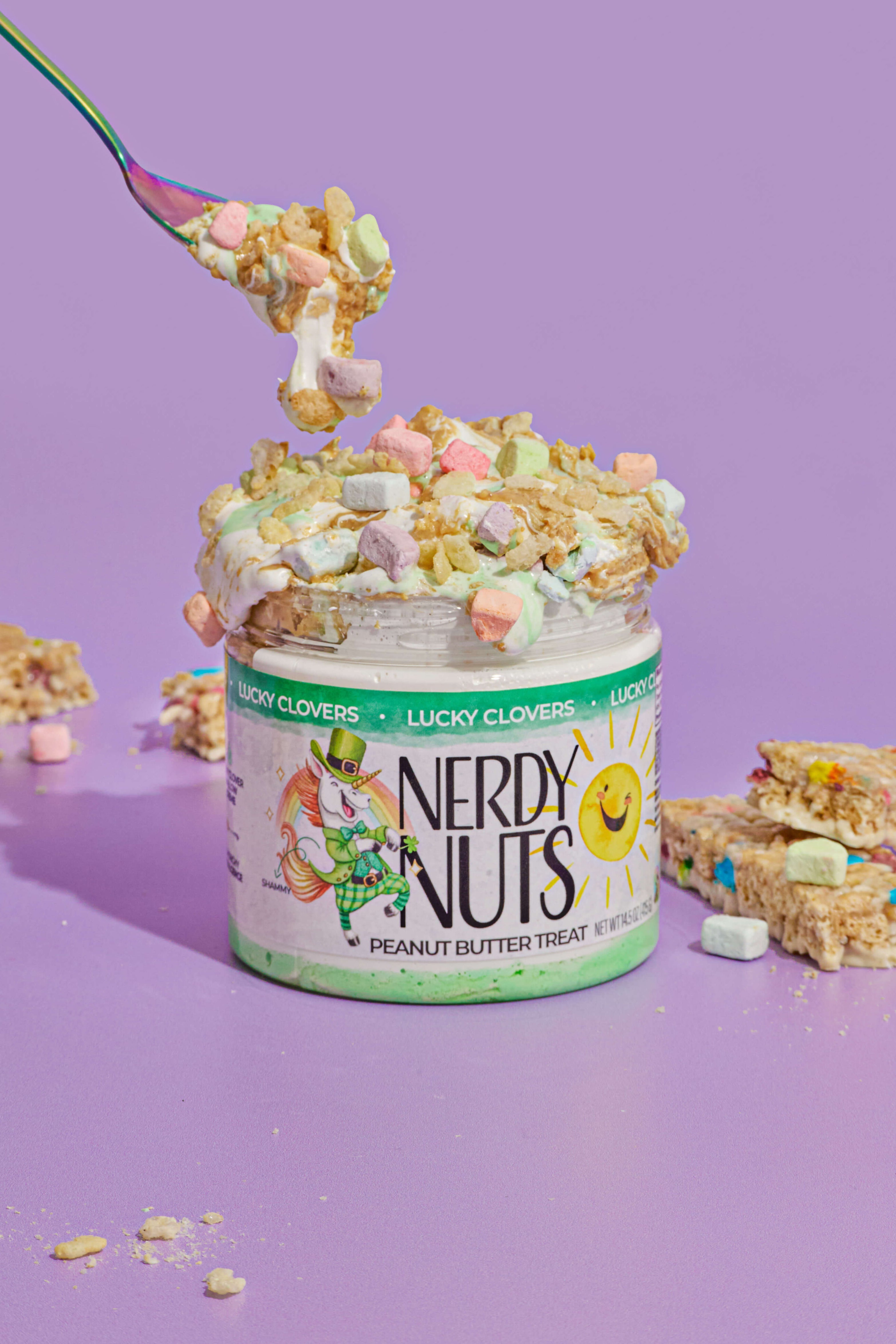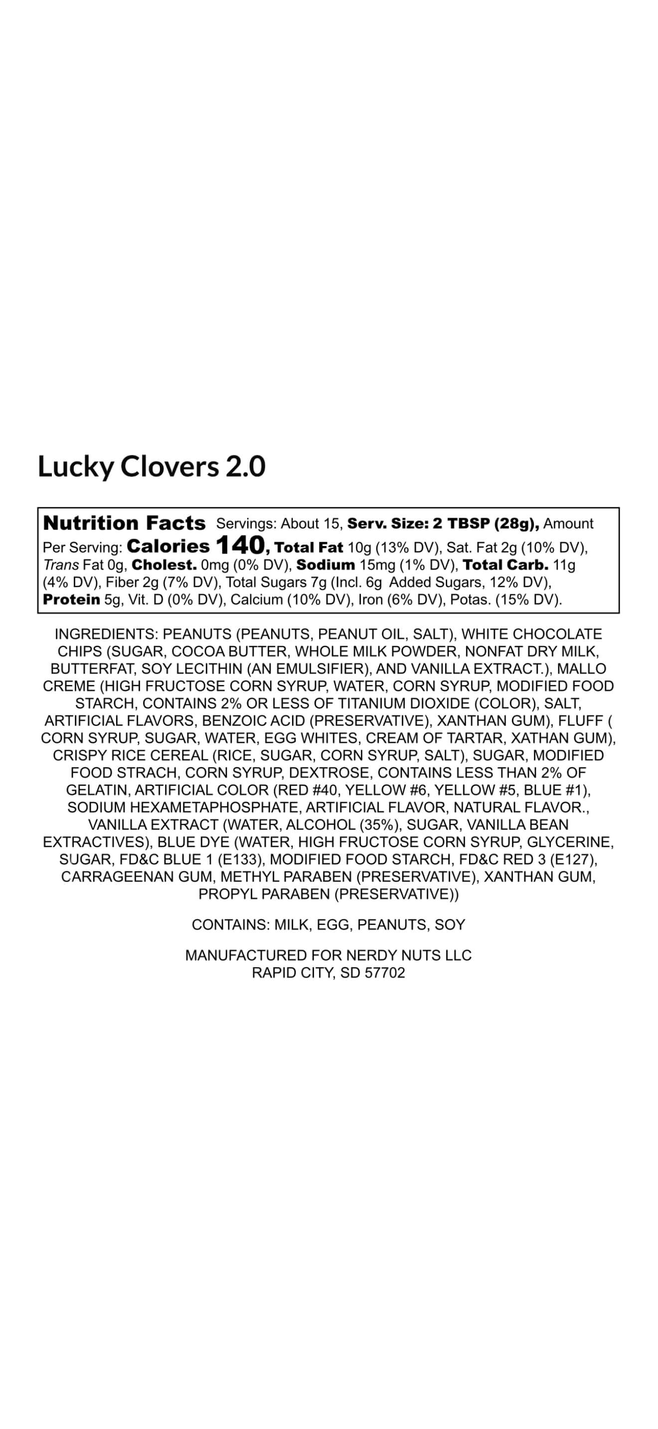 White chocolate peanut butter is layered on fluff & lucky clover mallow creme, topped with crispy rice cereal & rainbow dehydrated mallow bits!
