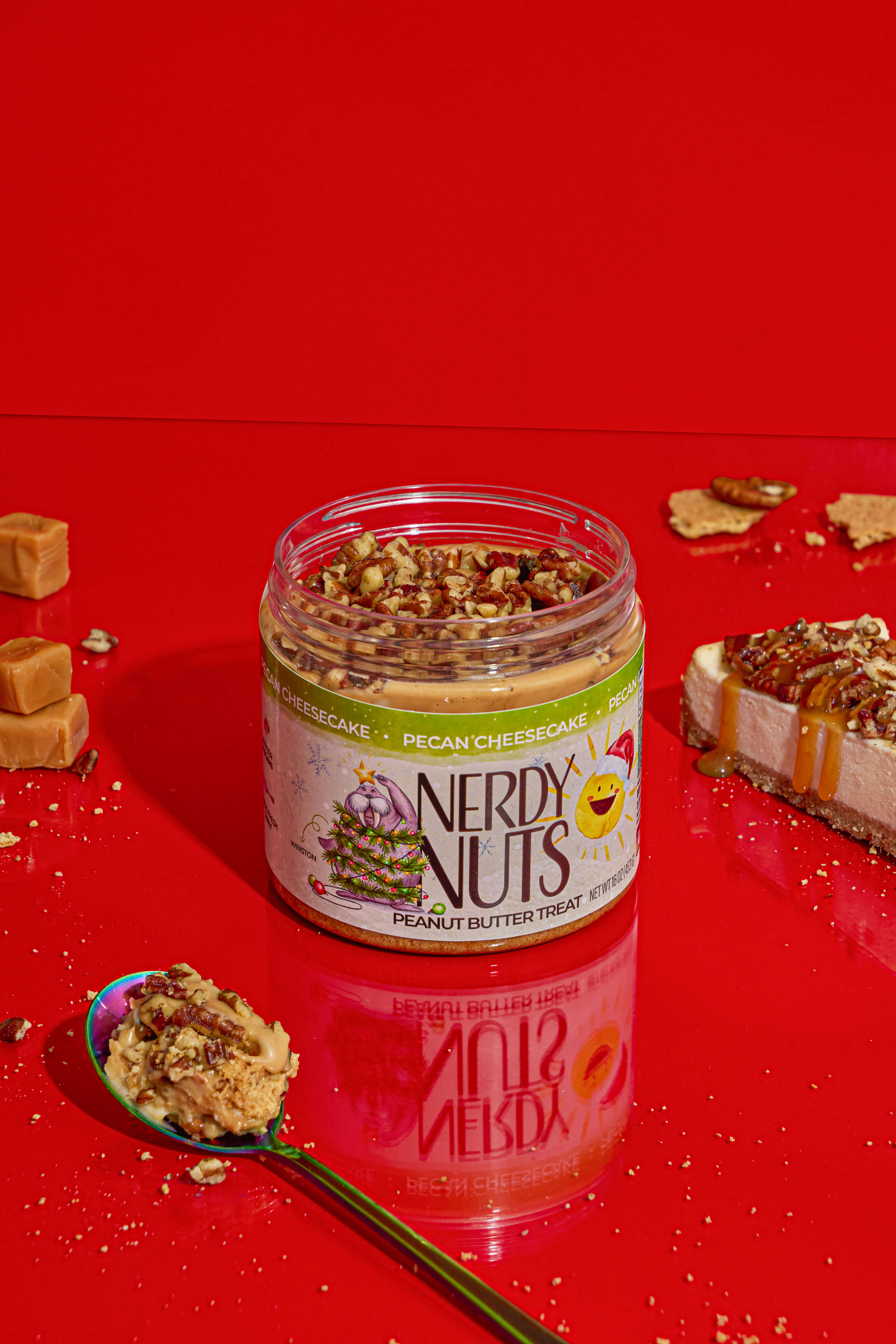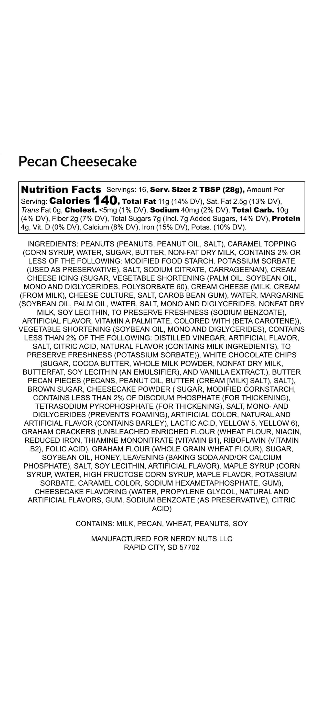 Brown sugar cheesecake peanut butter is layered on graham cracker crumbs, topped with caramel pecan cheesecake topping & buttered pecans!