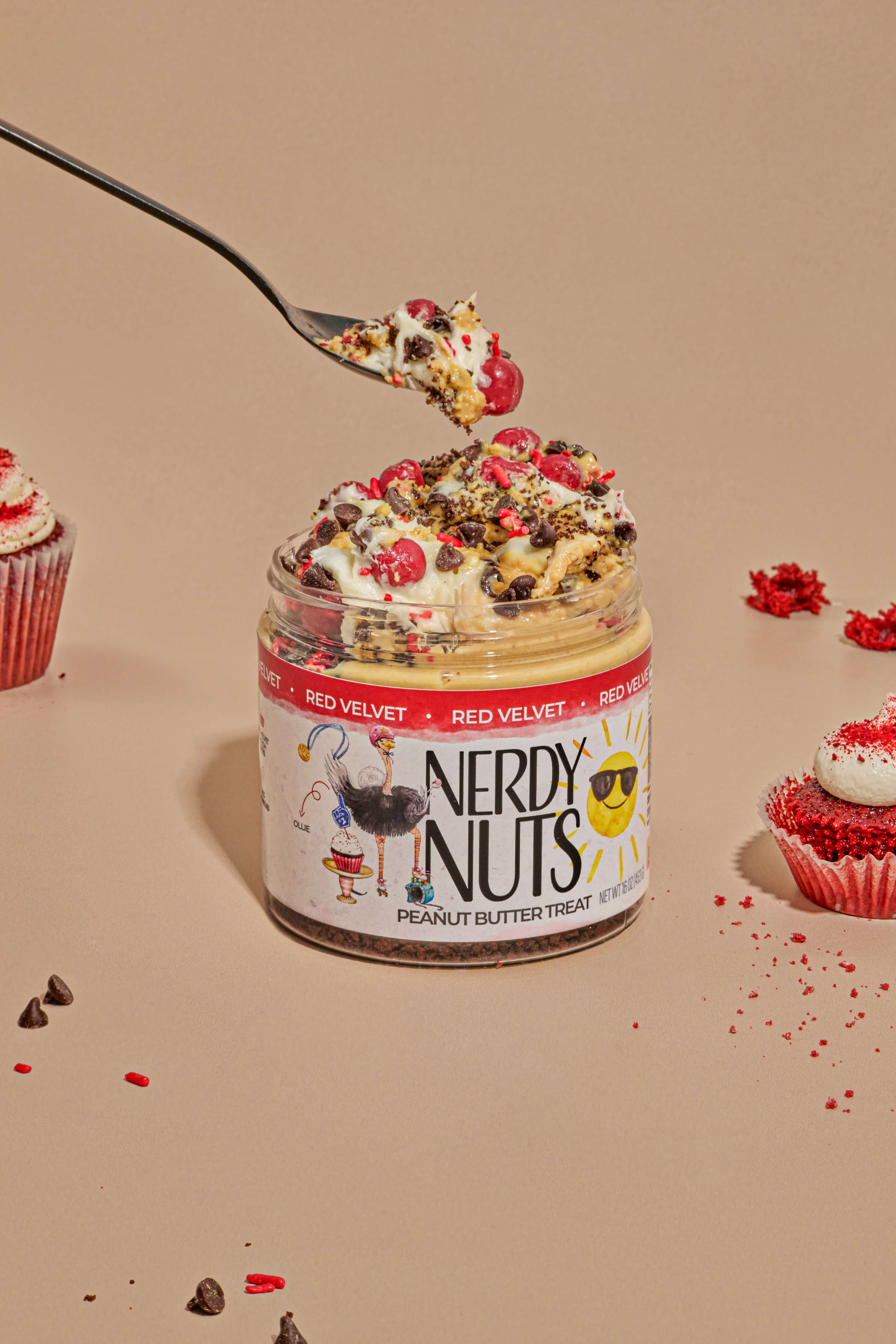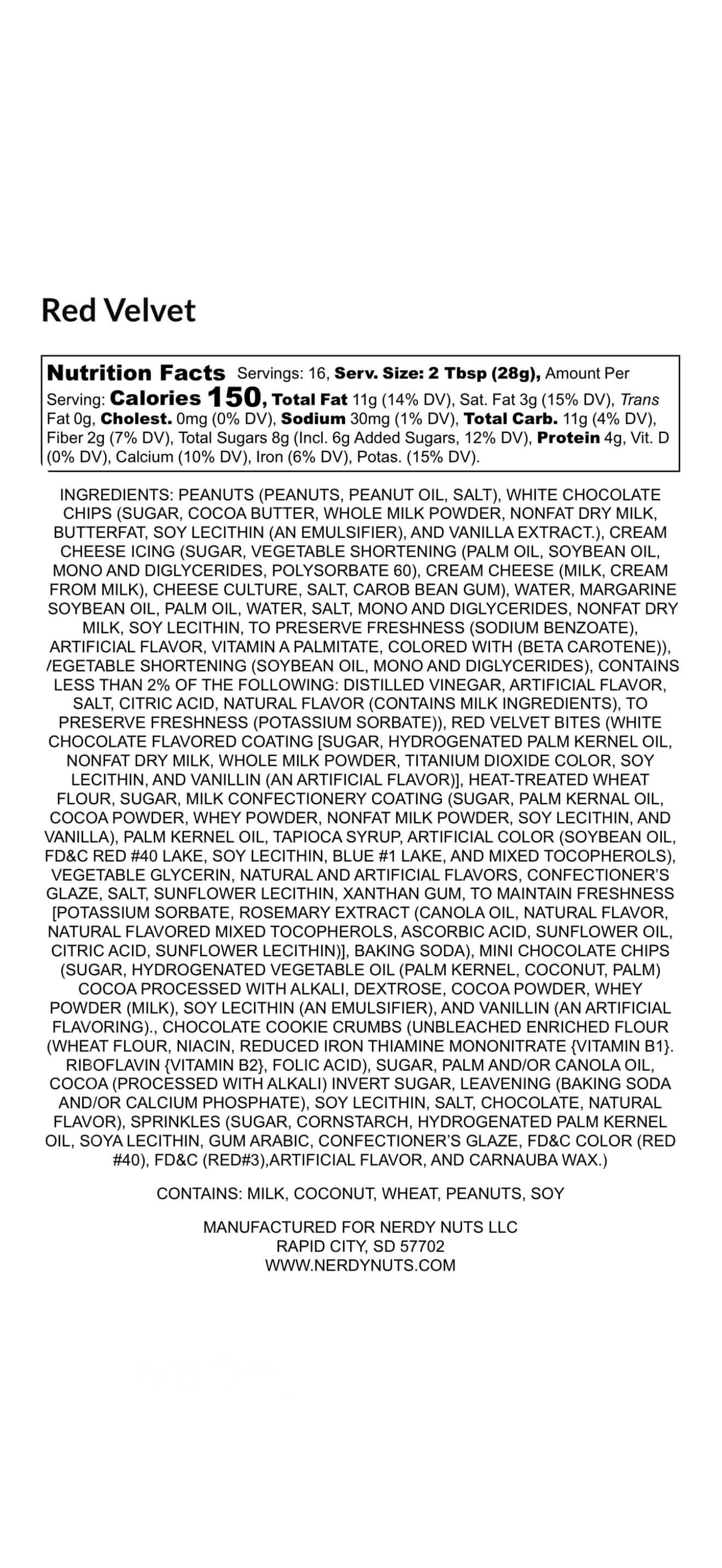White chocolate Nerdy Nuts peanut butter layered on chocolate cookie crumbs, topped with cream cheese frosting, red jimmies, mini chocolate chips, and red velvet cookie dough bites. Spoon it as a snack or spread it! You cannot go wrong.