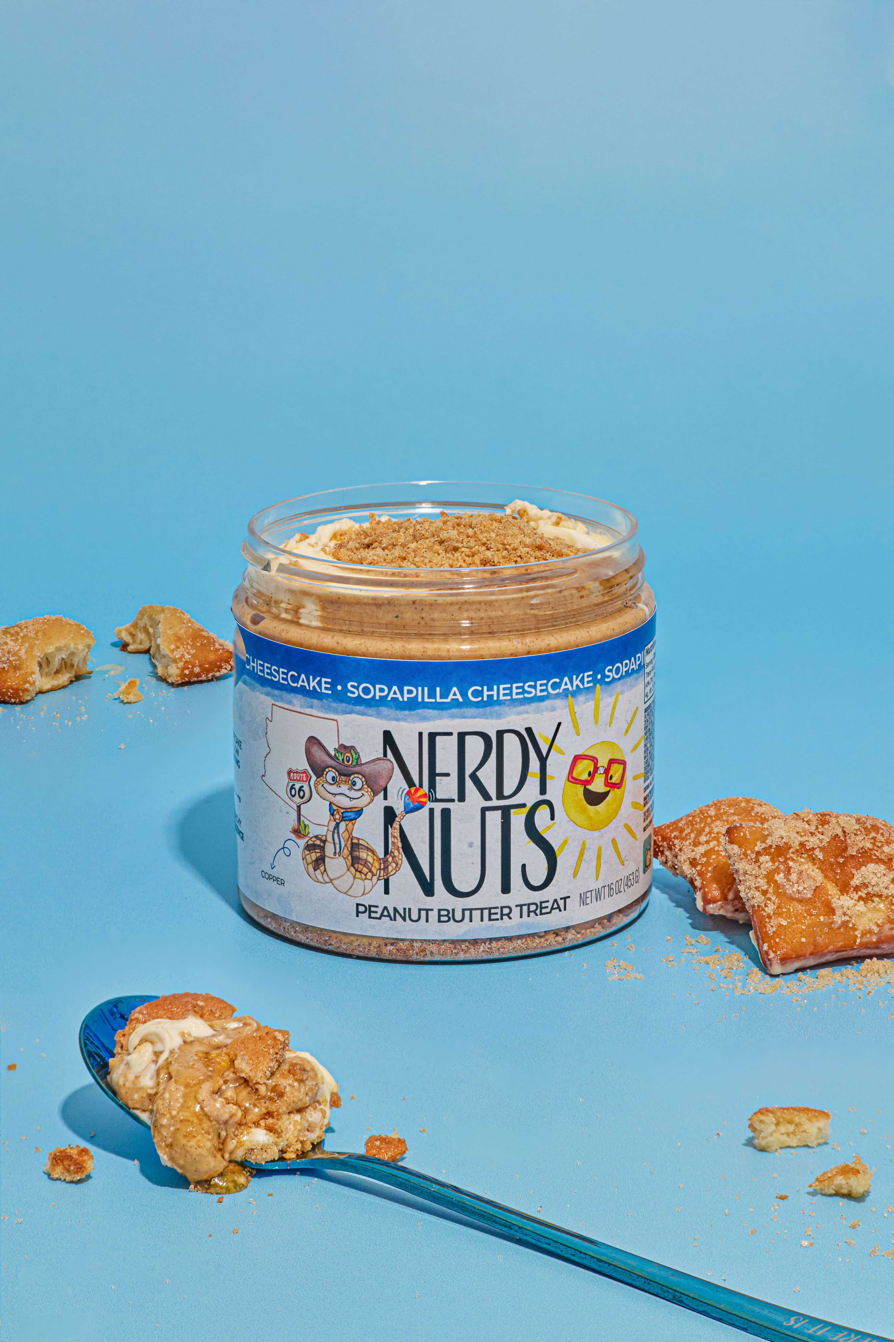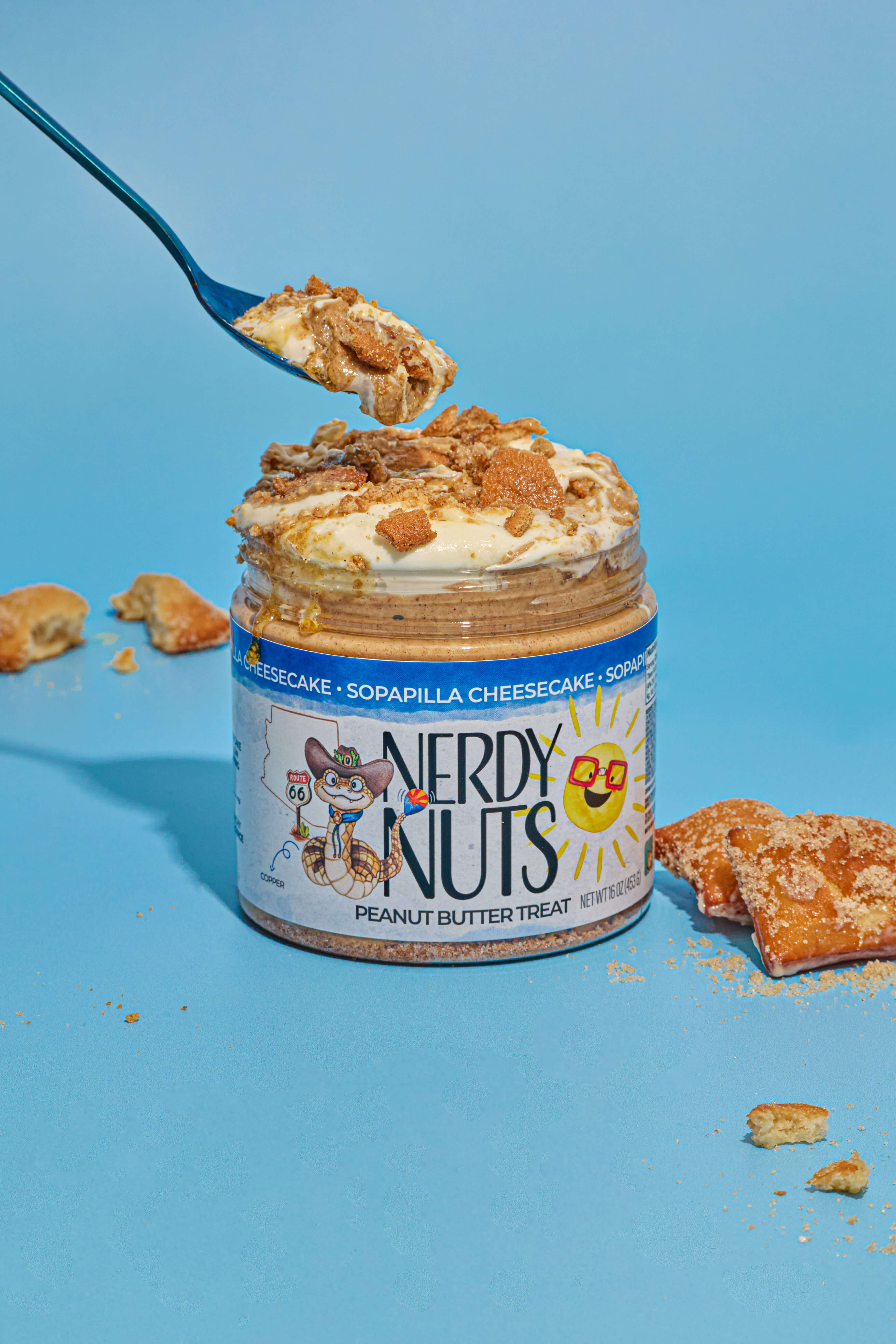 Sopapilla Cheesecake starts with cinnamon cheesecake peanut butter doused with cheesecake mallow frosting, cinnamon sugar cookies, cinnamon streusel, and a hefty drizzle of honey! This cheesecake treat is packing the AZ heat!