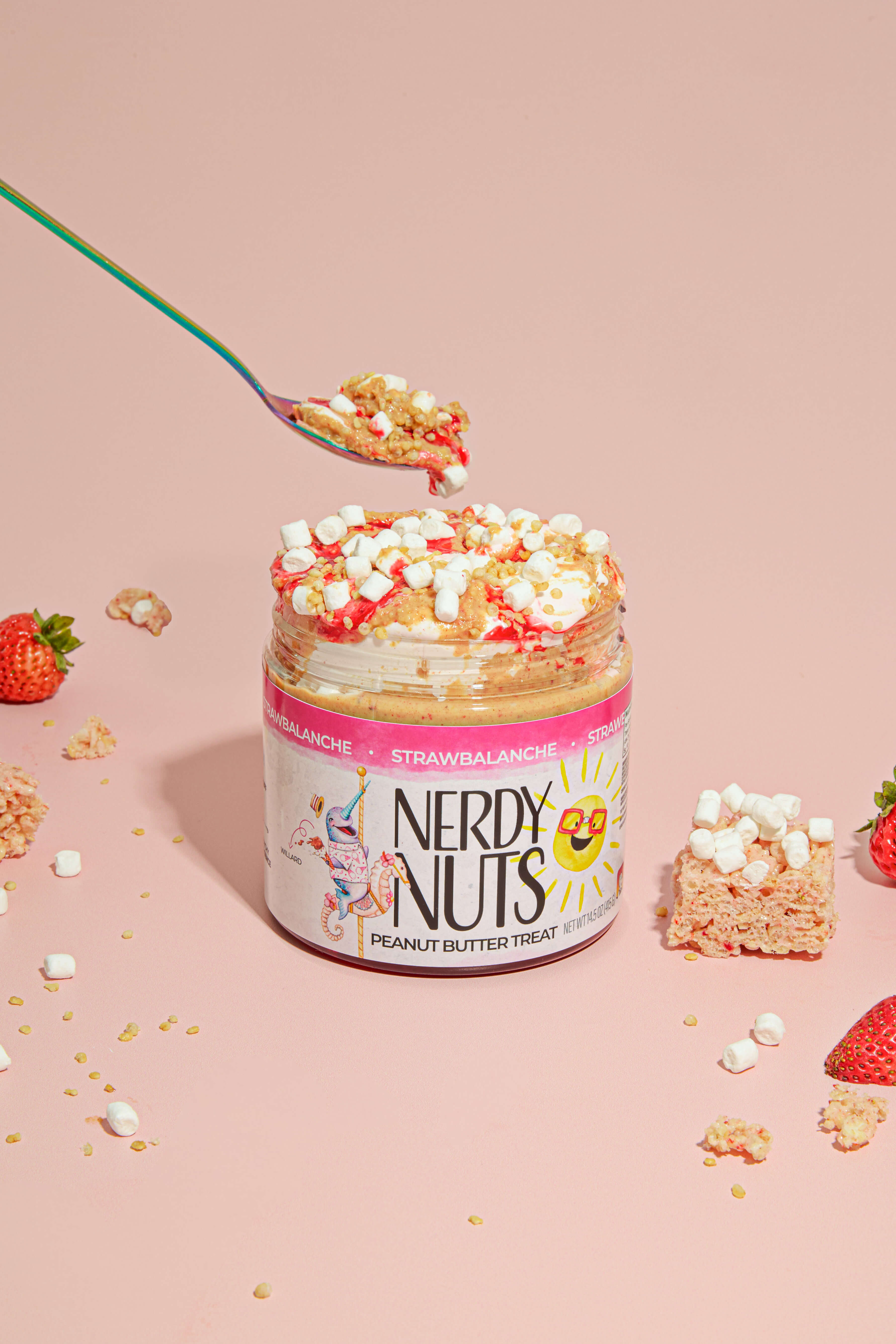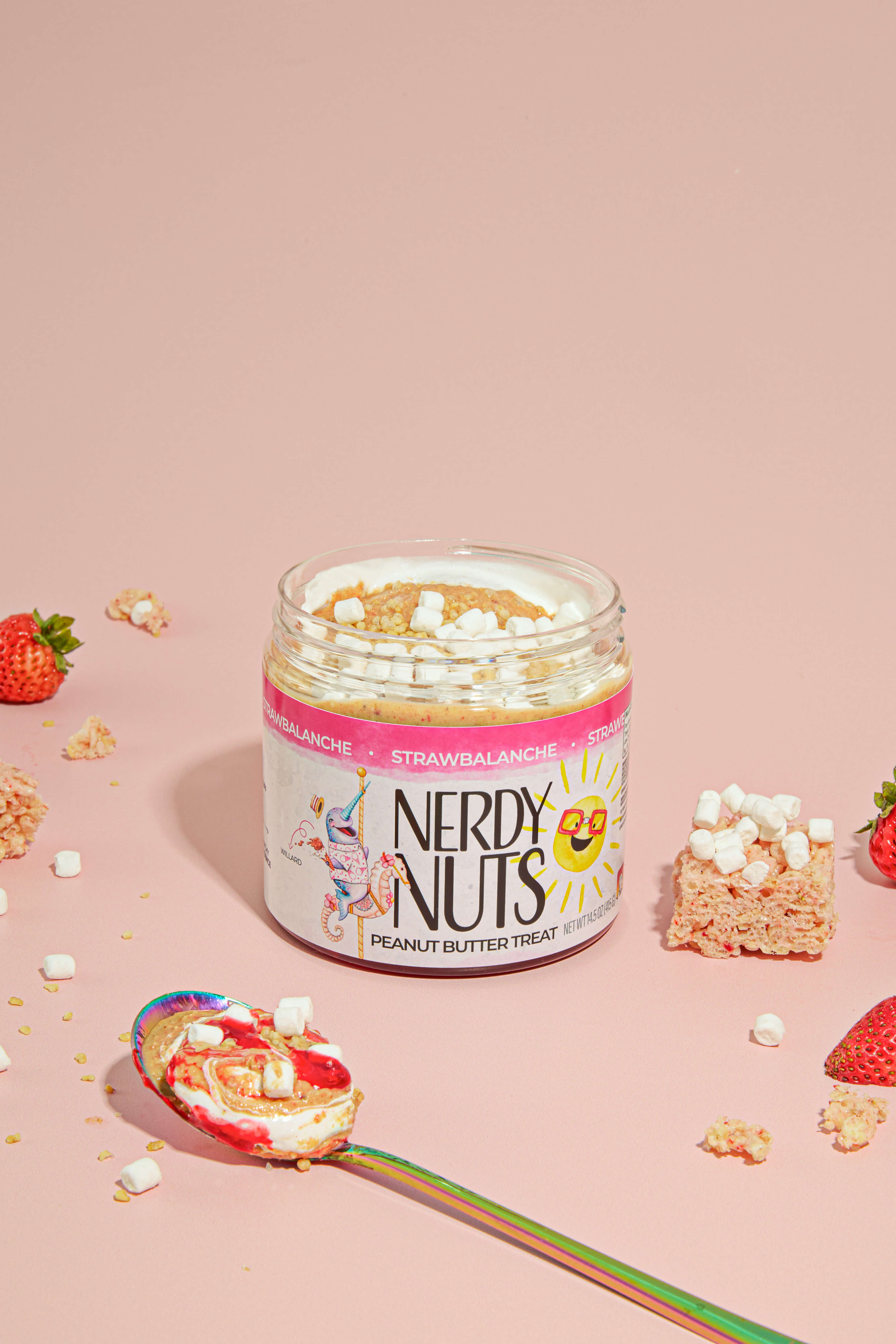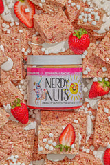 Strawberry milk white chocolate peanut butter is layered on fluff and strawberry sauce, topped with dehydrated mallow bits and crispy puffed quinoa! The crunch factor in this dessert is unmatched!